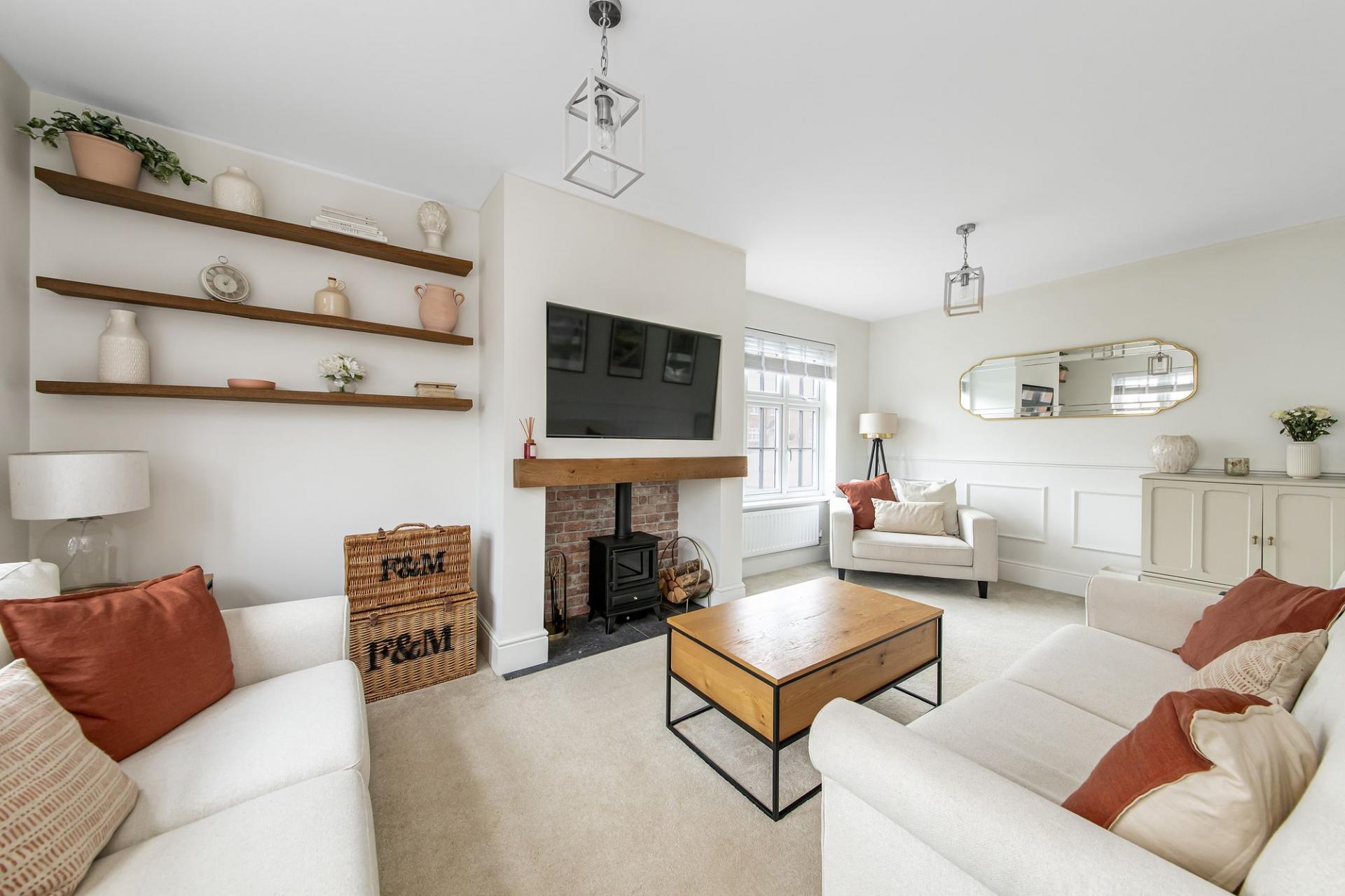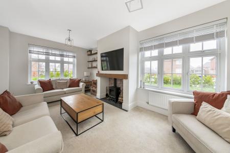 - Striking, double aspect living room featuring an attractive faux chimney with inset electric fire. A beautifully presented room with wooden panelling detailing and bespoke venetian blinds