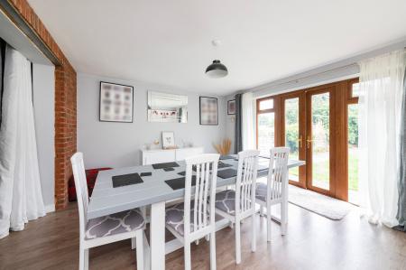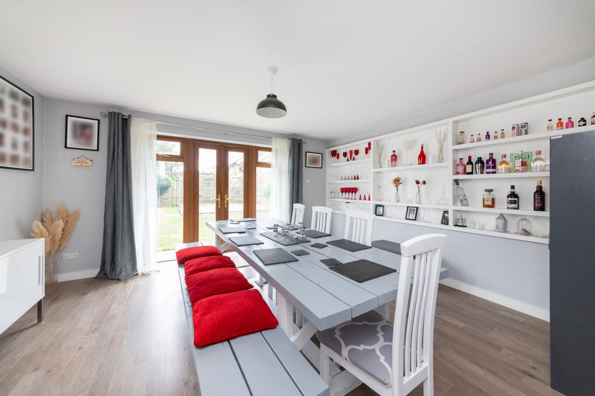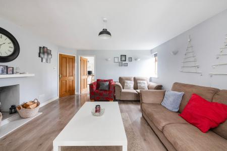 - Living room with attractive fireplace featuring inset cast iron log burning stove, partly open plan to spacious dining room with double doors to rear gardens