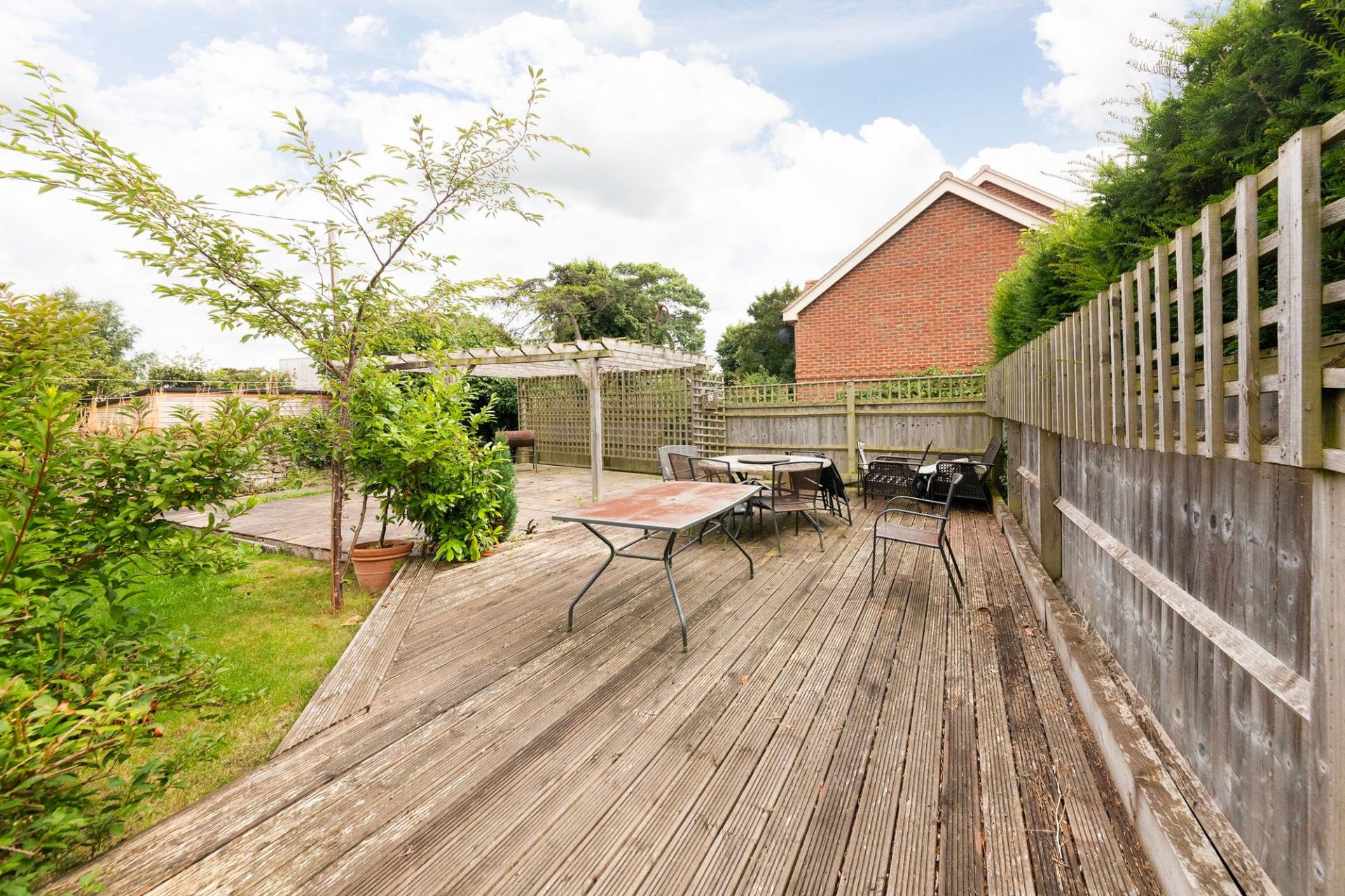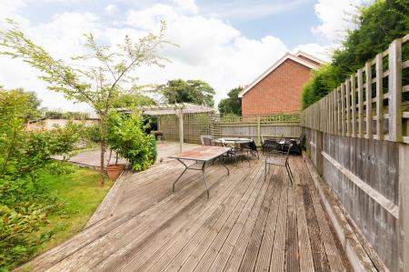 - Good size rear gardens featuring extensive patio and large decked terrace with pergola over - the whole enclosed by fencing and walling , providing good degrees of privacy