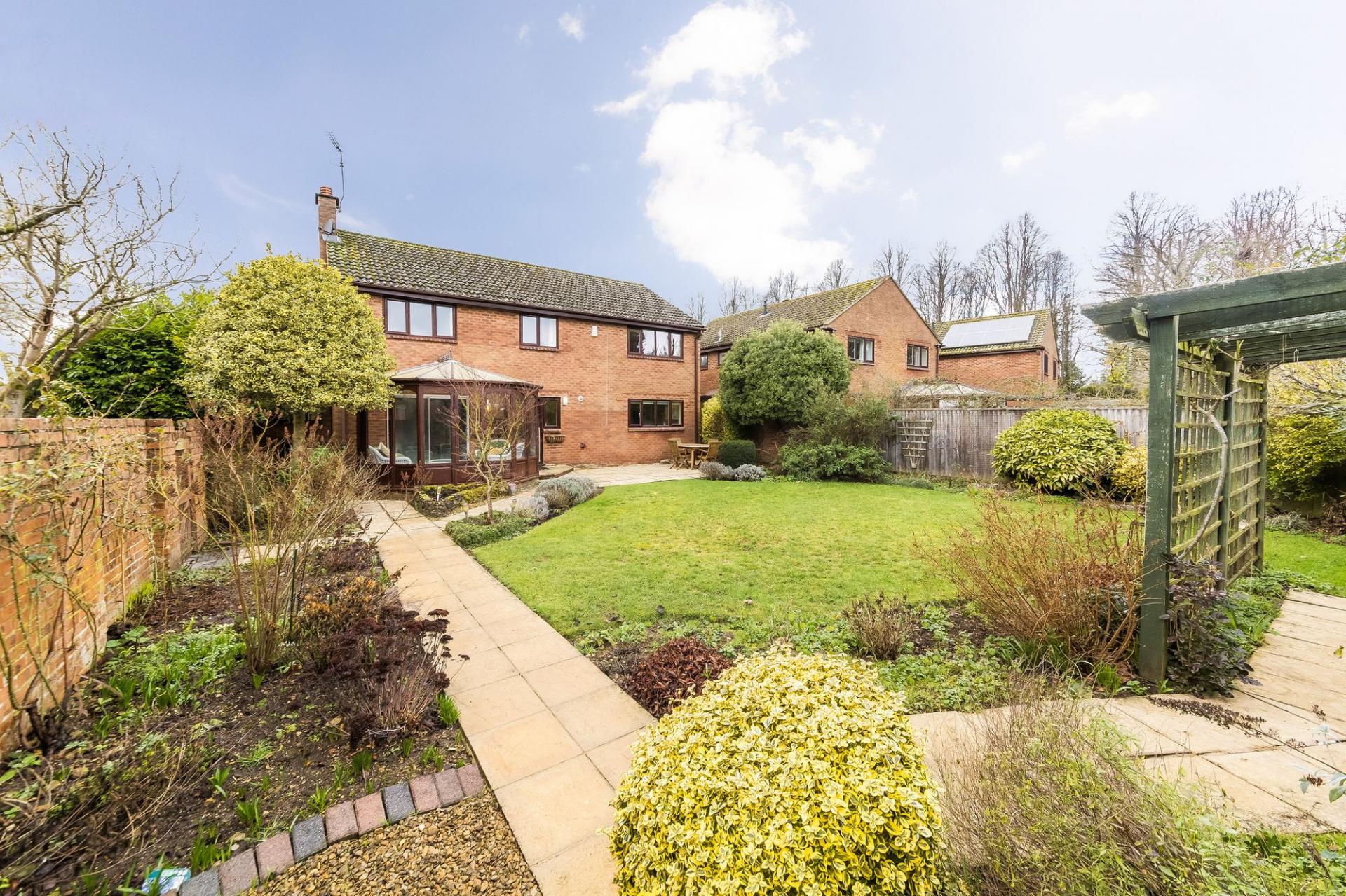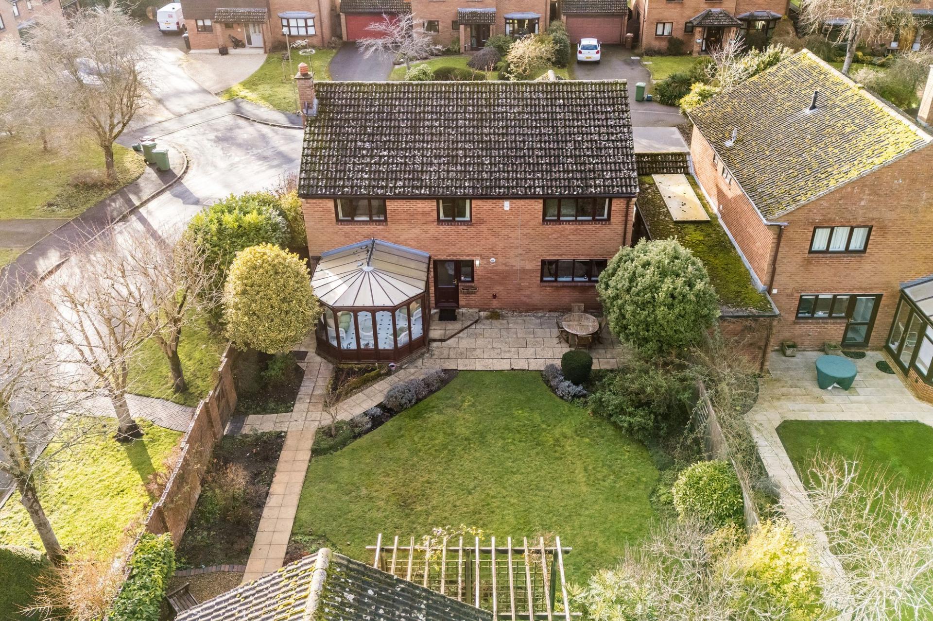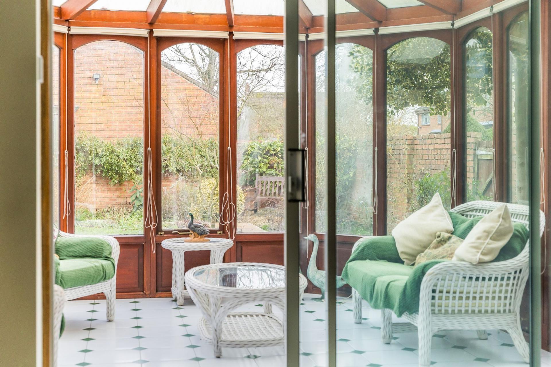 - Generous 17'6 living room with a feature fireplace and sliding doors leading into a wooden framed conservatory providing panoramic views over the gardens