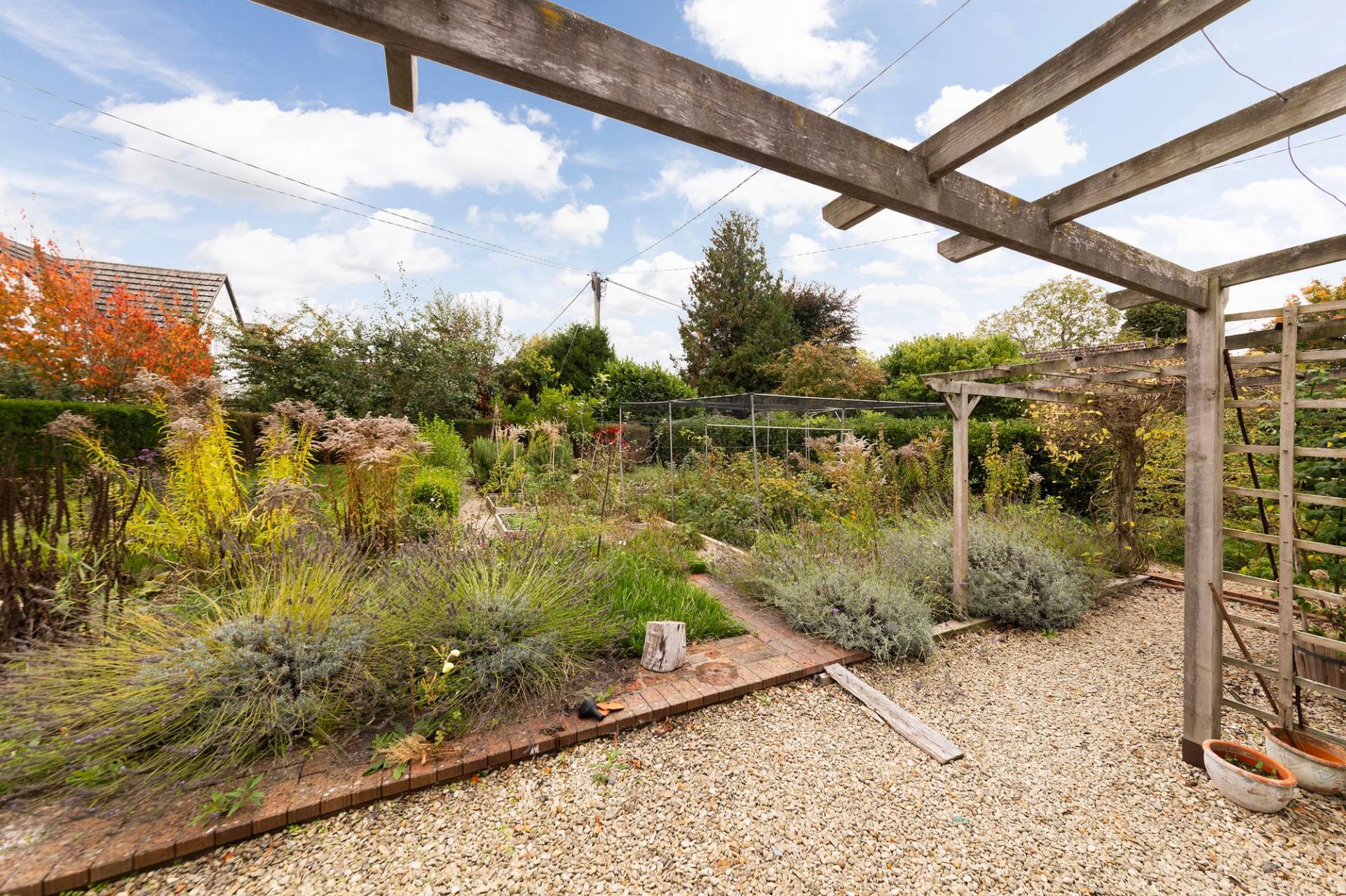 - Large mature south-east facing rear gardens with large patio leading onto mature well stocked raised vegetable and flower beds, fully enclosed by hedges and fencing