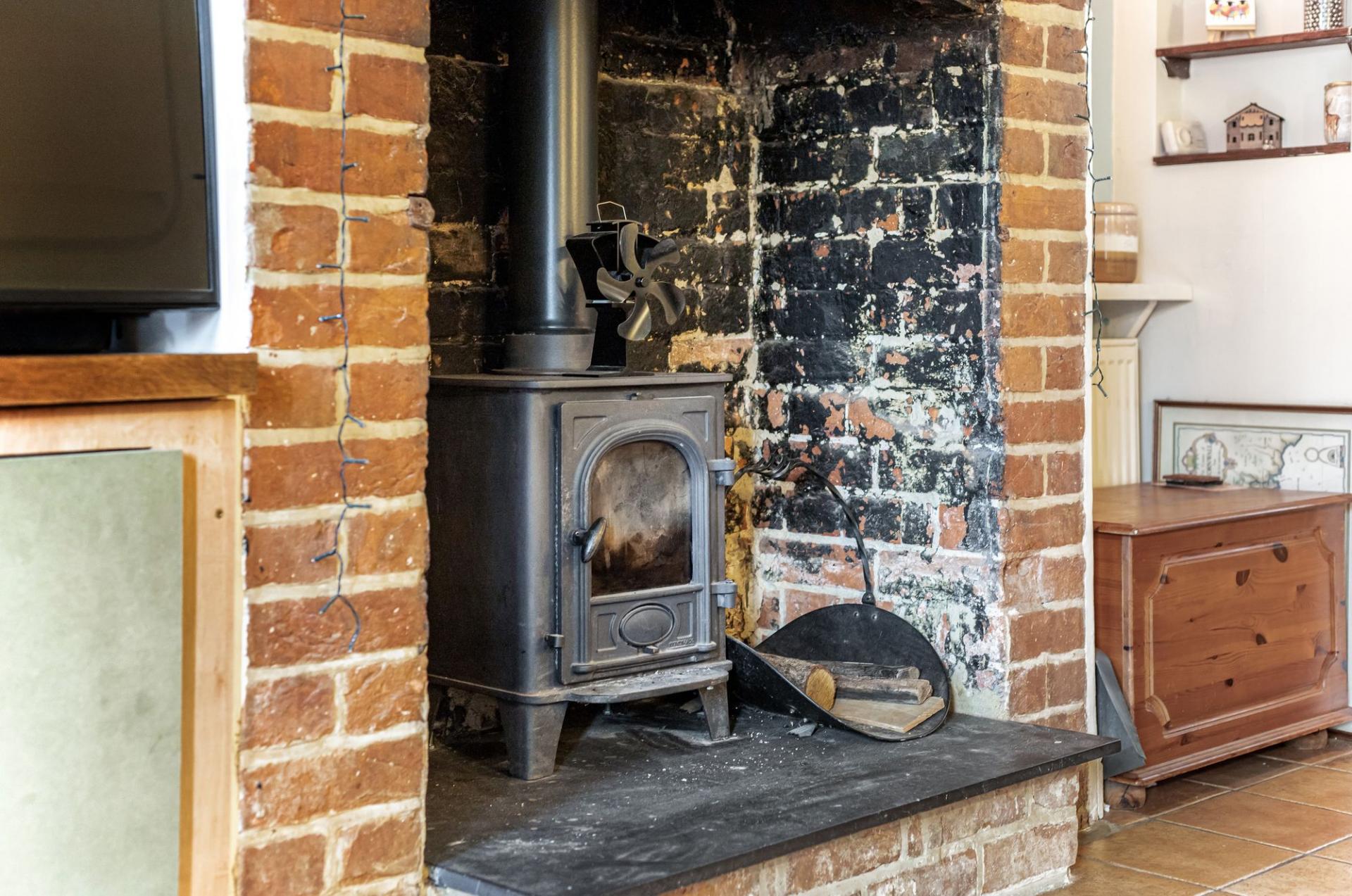 - Enclosed entrance porch leading to delightful front living room with beamed ceiling and large open fireplace with inset cast iron log burning stove