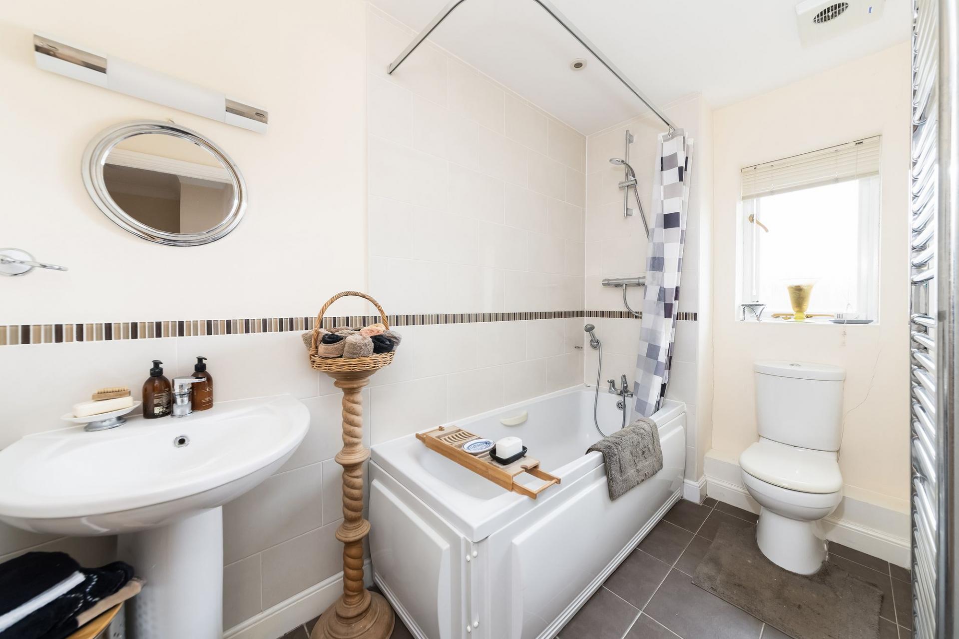 - Delightful first floor main double bedroom with built-in wardrobe cupboards, spacious second bedroom and bathroom with white suite.