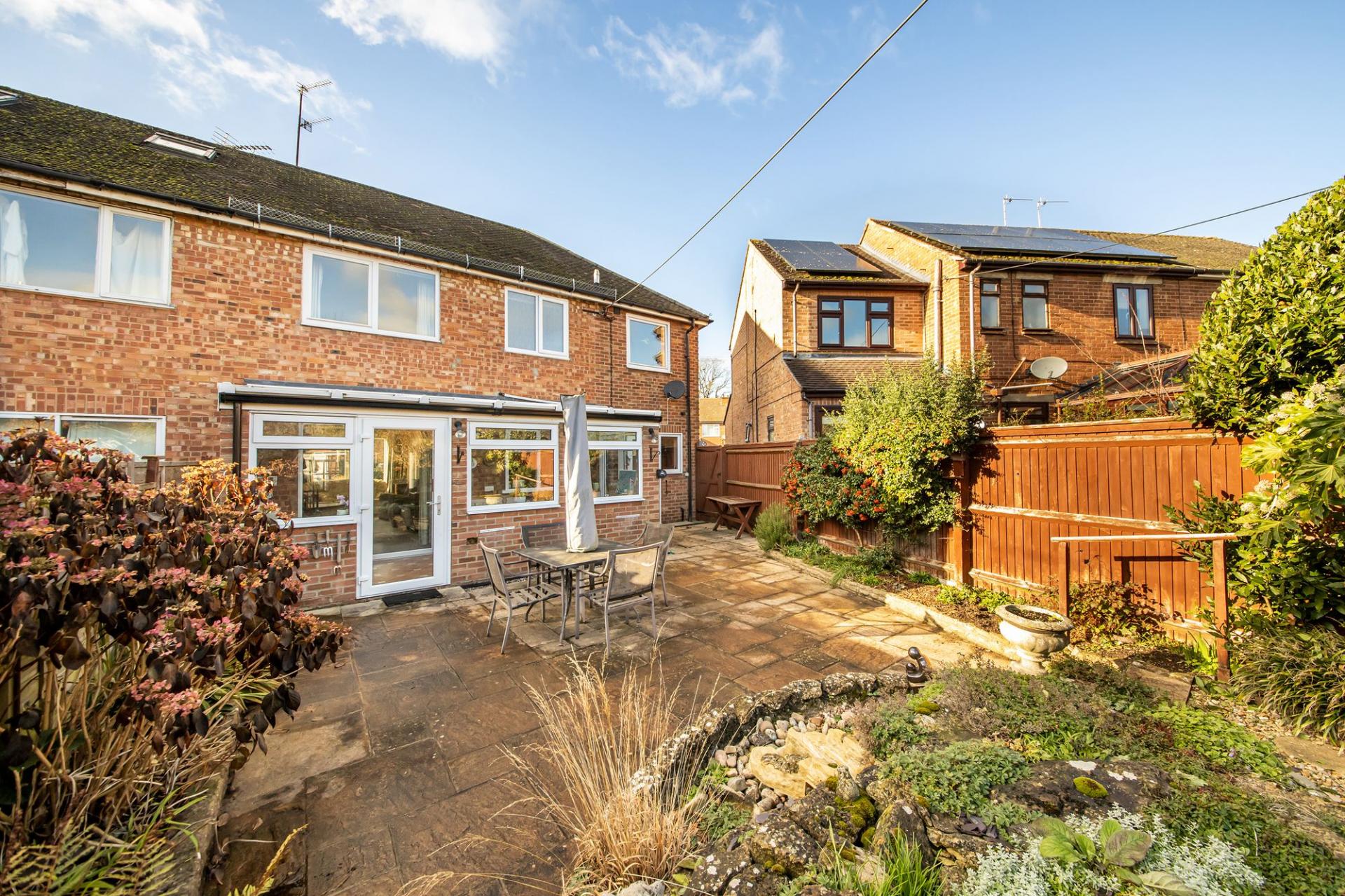 - Attractive rear gardens featuring extensive patio providing delightful seating areas surrounded by mature flower and shrub borders before leading to wooden garden store - the whole enclosed by fen...