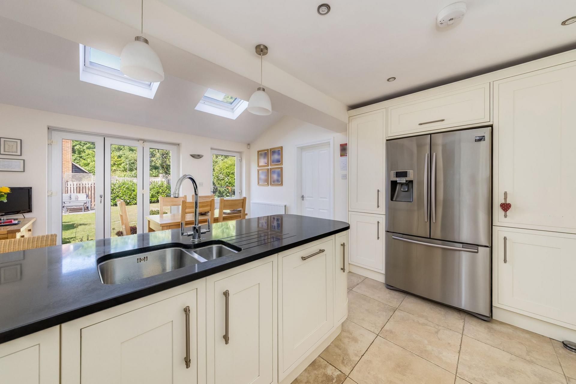 - Striking, light, open plan kitchen dining room, with modern fitted kitchen flowing through to dining room featuring a vaulted ceiling and bi-folding doors opening onto the rear garden.