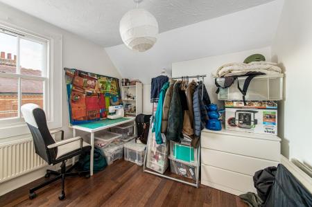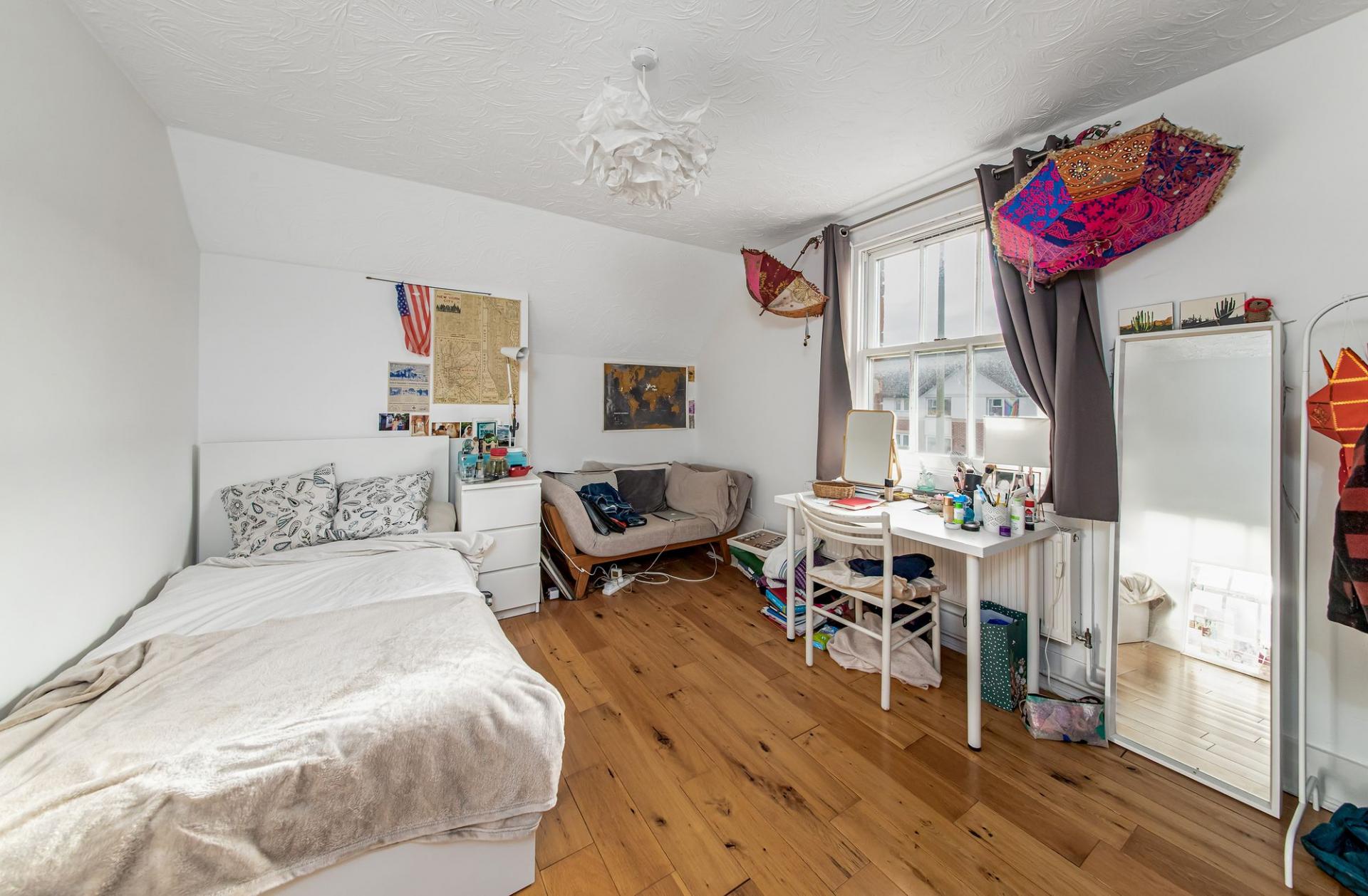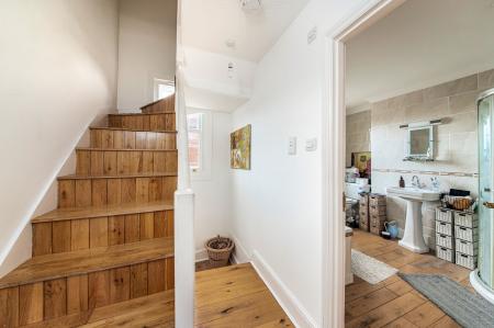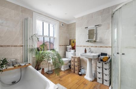 - First floor includes a stylish three-piece family bathroom and a main bedroom with built-in storage and original fireplace