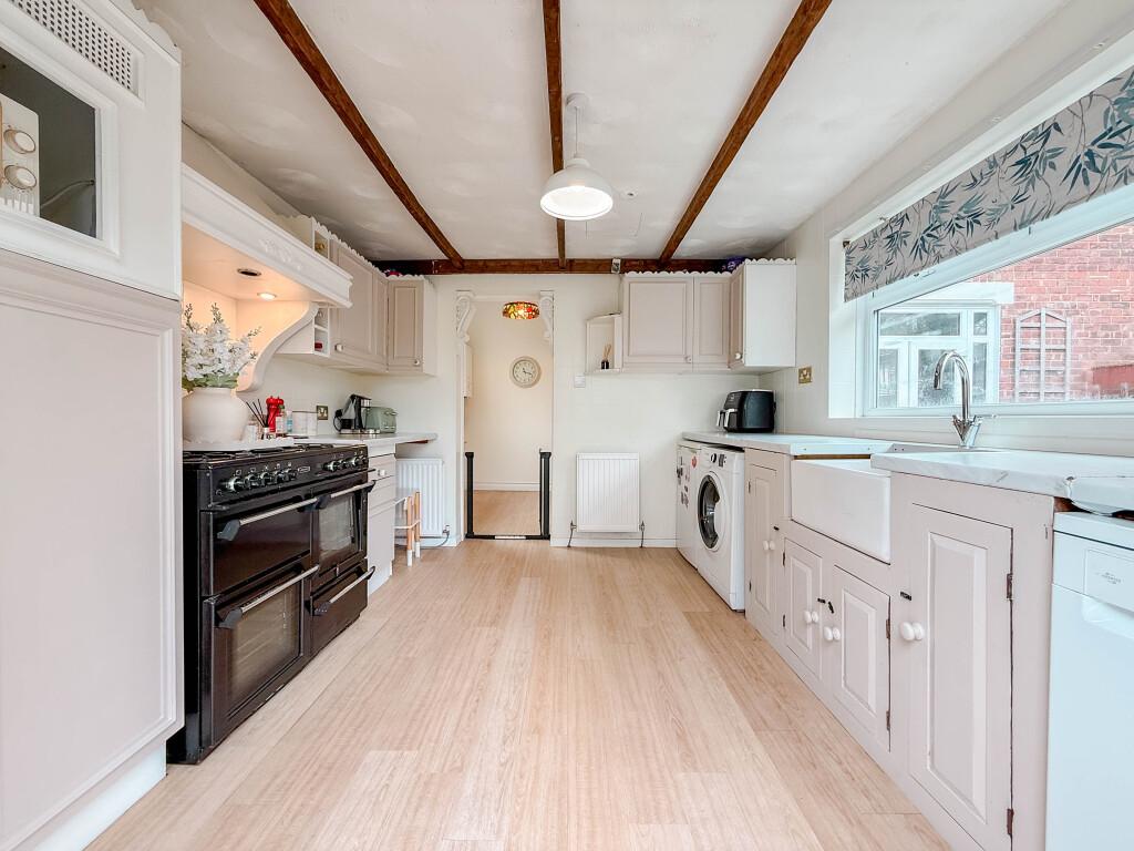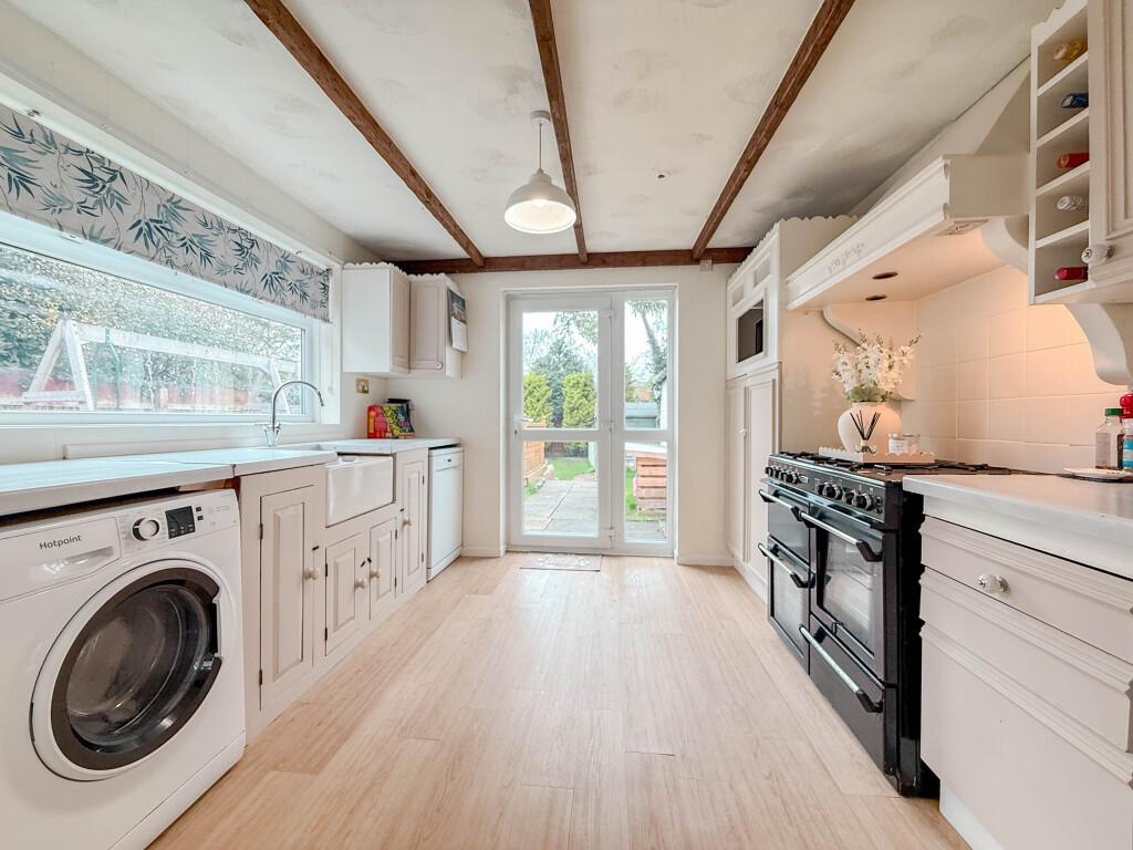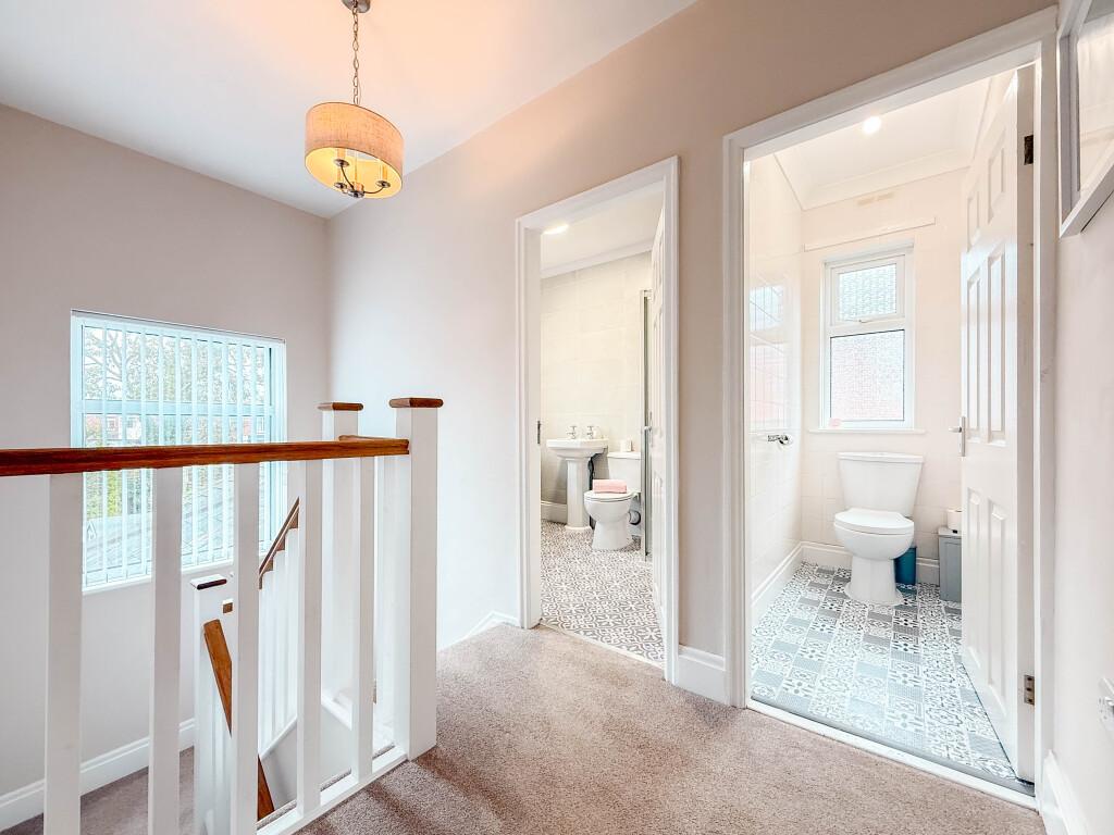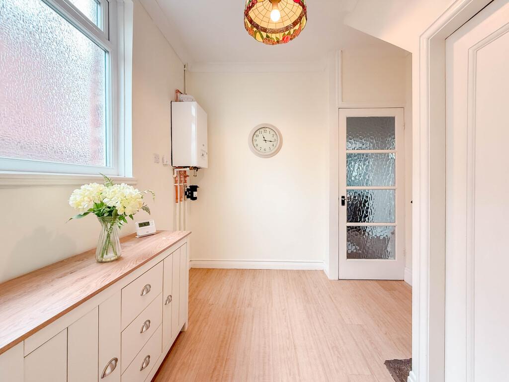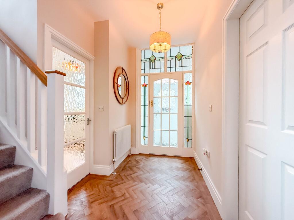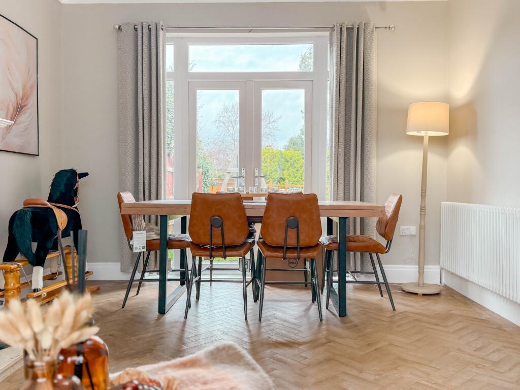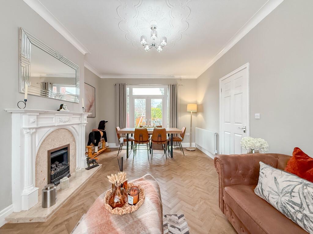 The accommodation begins with an entrance vestibule leading to a spacious hallway, separated by a timber framed, partially glazed door with characterful stained glass, a charming touch that sets the tone for the rest of the home. The bay fronted lounge features a striking brick feature wall and a multi-fuel burning stove, while the second lounge/diner spans the full depth of the property and includes French doors opening onto the rear garden. At the rear of the ground floor, the spacious kitchen is fitted with a range of timber base and wall units, a Belfast sink, Range style cooker and includes French doors to the garden. Upgraded LVT features within the hallway, lounge & second lounge/diner.
