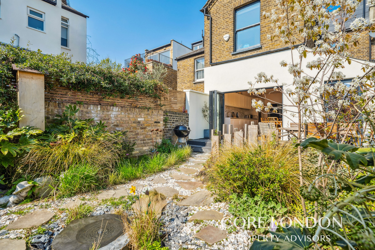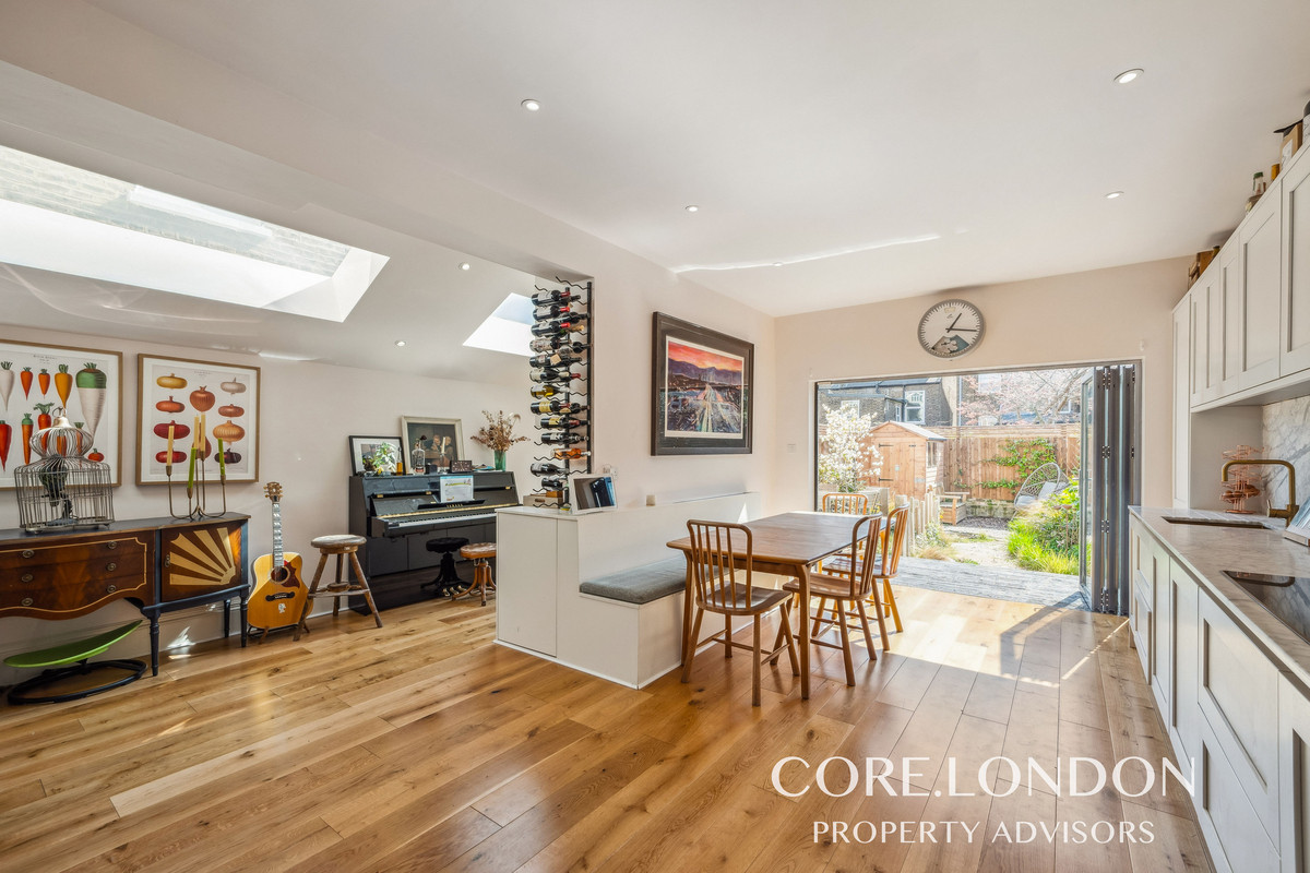 The rear reception area features bifold doors that open onto a beautifully wild, south-facing garden — one of the standout features of this family home.
