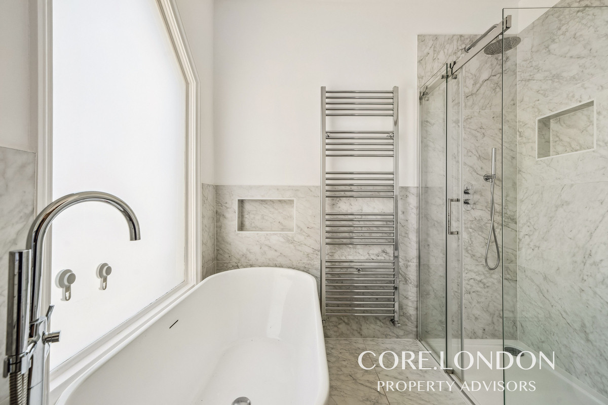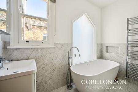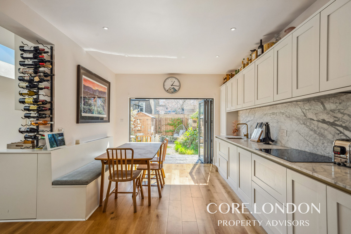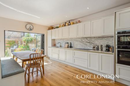 We believe the house was originally retained by the master builder of Shakespeare Road, and as a result, it is naturally wider than the majority of homes on the street. Upon entering, you're welcomed by a particularly spacious double reception room that retains many of its original features. To the rear, the property has been extended to include a generous kitchen-family room, flooded with natural light. The smart kitchen is finished with a marble worktop and integrated appliances and includes a sectioned-off utility area with built-in units.