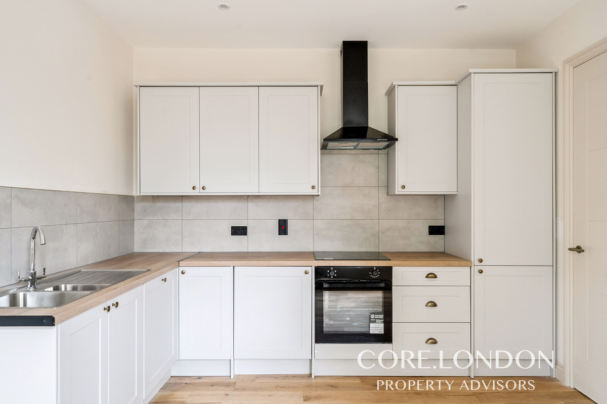 The apartment features a bright and spacious open-plan reception room with high ceilings, large sash-style windows, and a sleek fitted kitchen complete with integrated appliances, wood worktops, and brass fittings. The stylish bathroom has been finished to a boutique standard, with elegant tiling, a rainfall shower, and brushed gold fixtures.