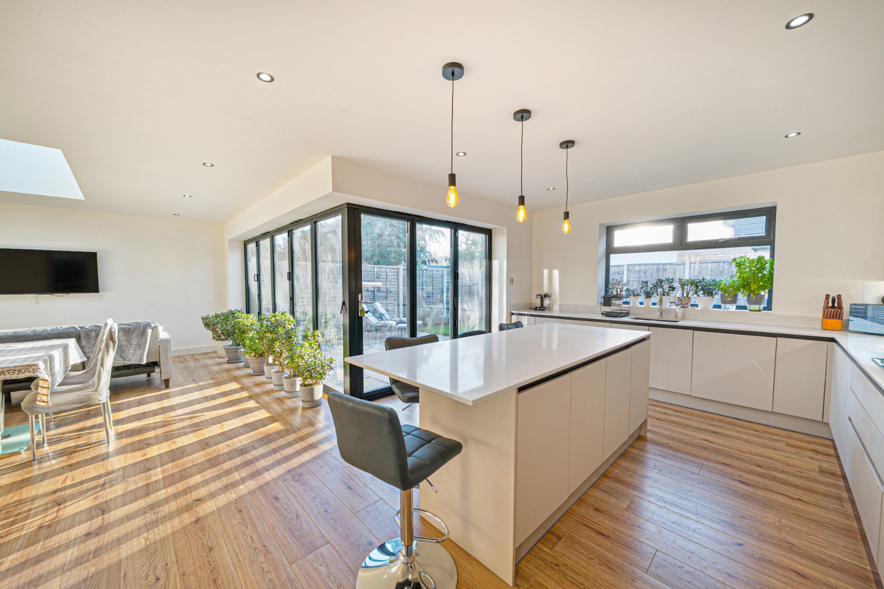 Stylish, turnkey living with a generous reception room featuring corner bi-fold doors opening seamlessly onto the garden, three modern bathrooms, and flexible bedroom space for families, multi-generational living, or home working.