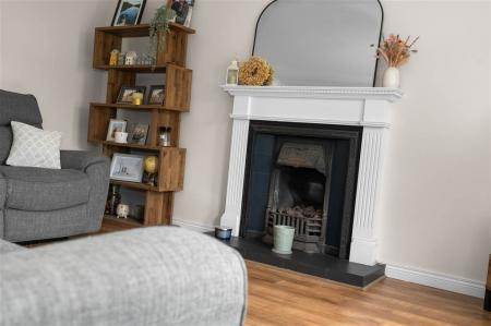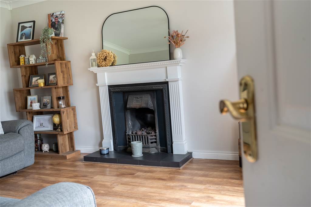 - Living room with cast-iron fireplace