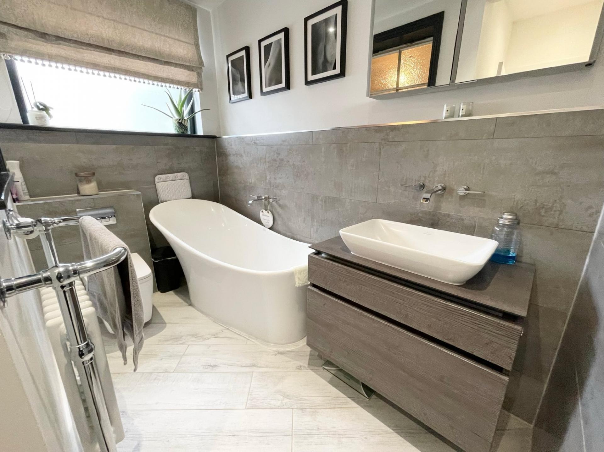 To the first floor are the four well-proportioned bedrooms as well as the family bathroom with walk in shower, free standing bath, WC and wash basin.