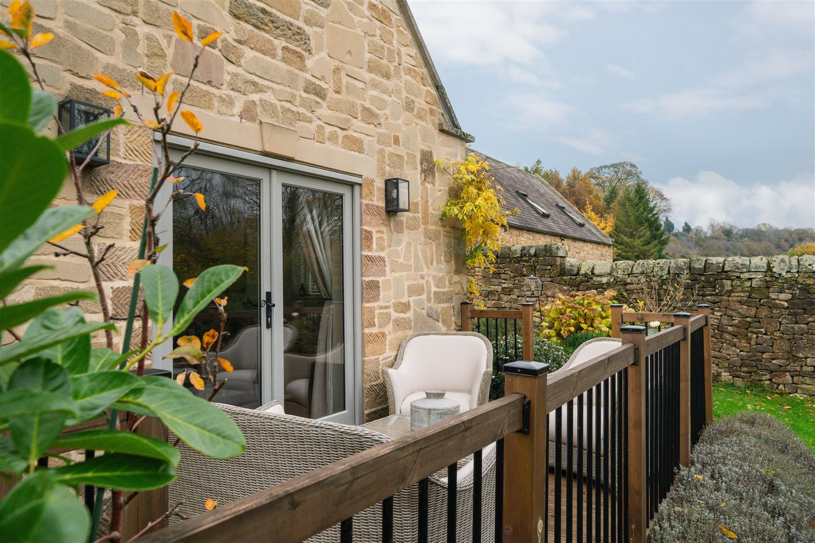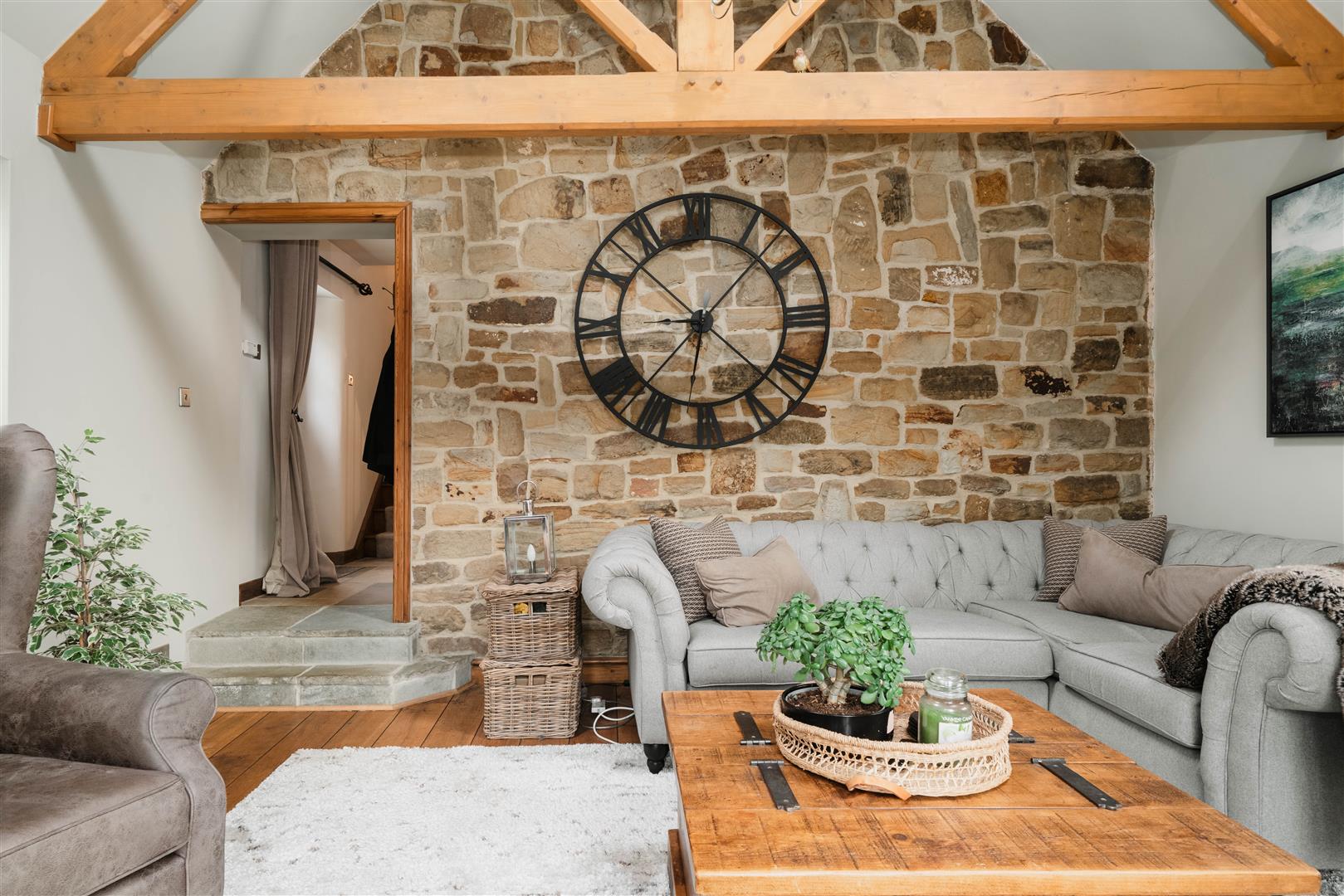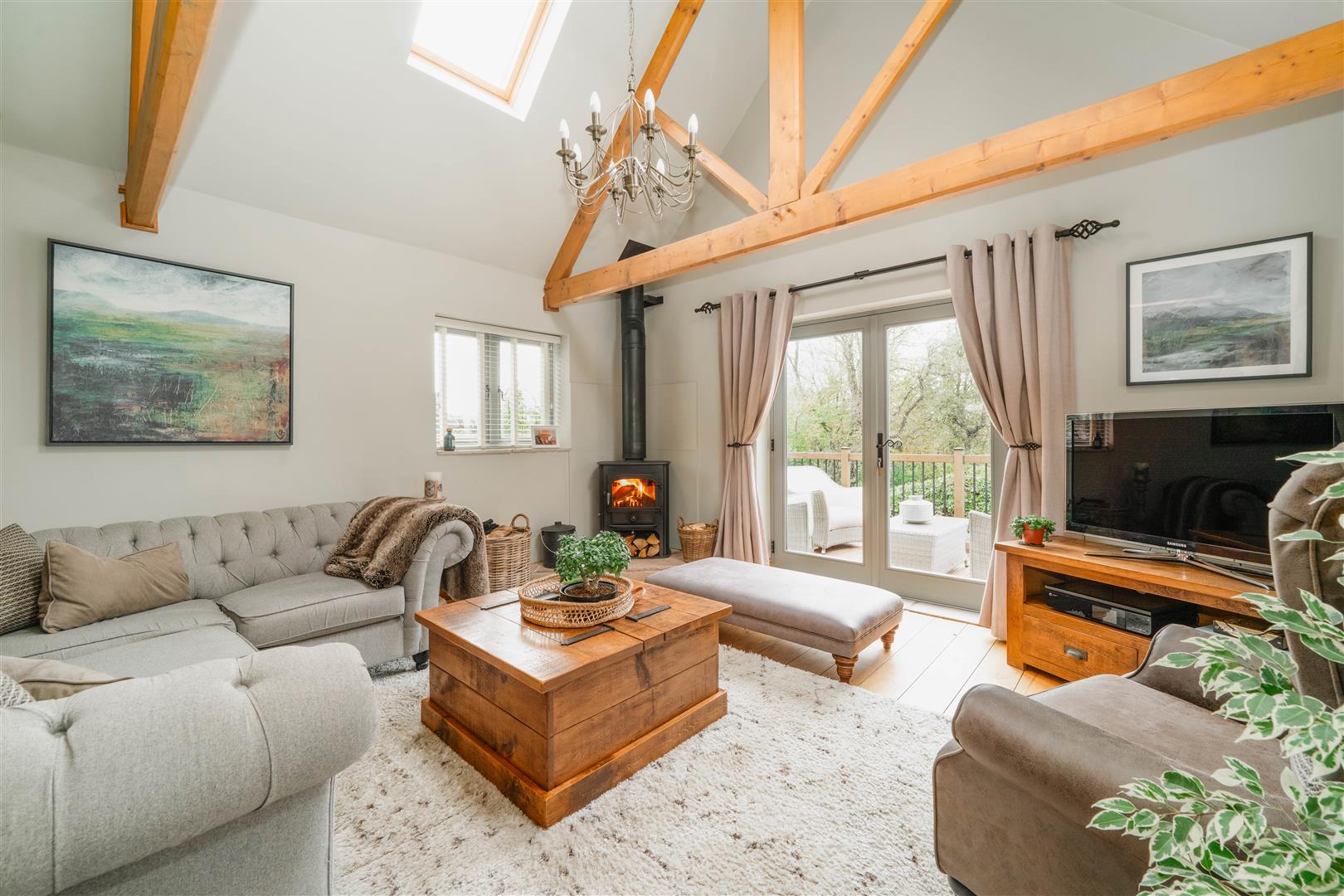- Stunning vaulted ceiling lounge with exposed stone wall, oak beams, log burner and patio doors onto the decked terrace