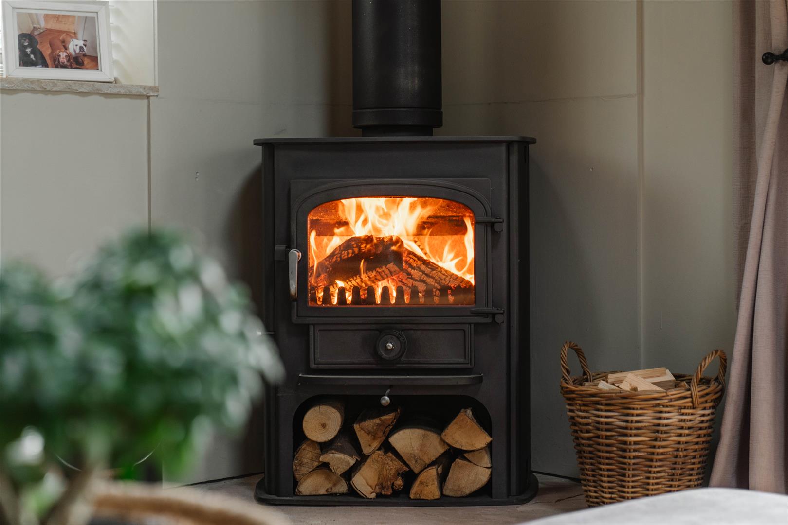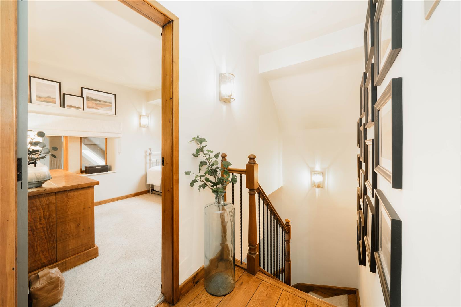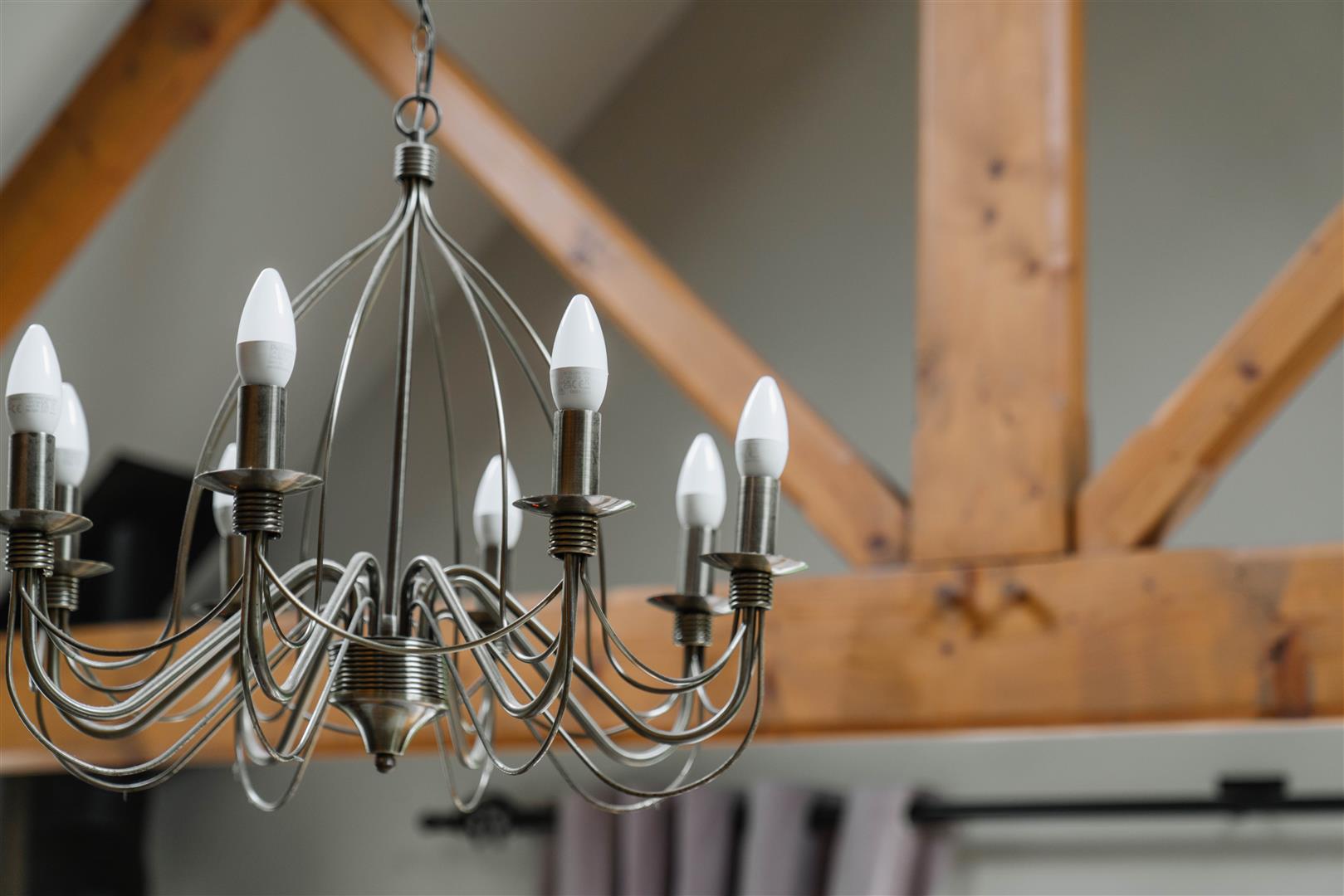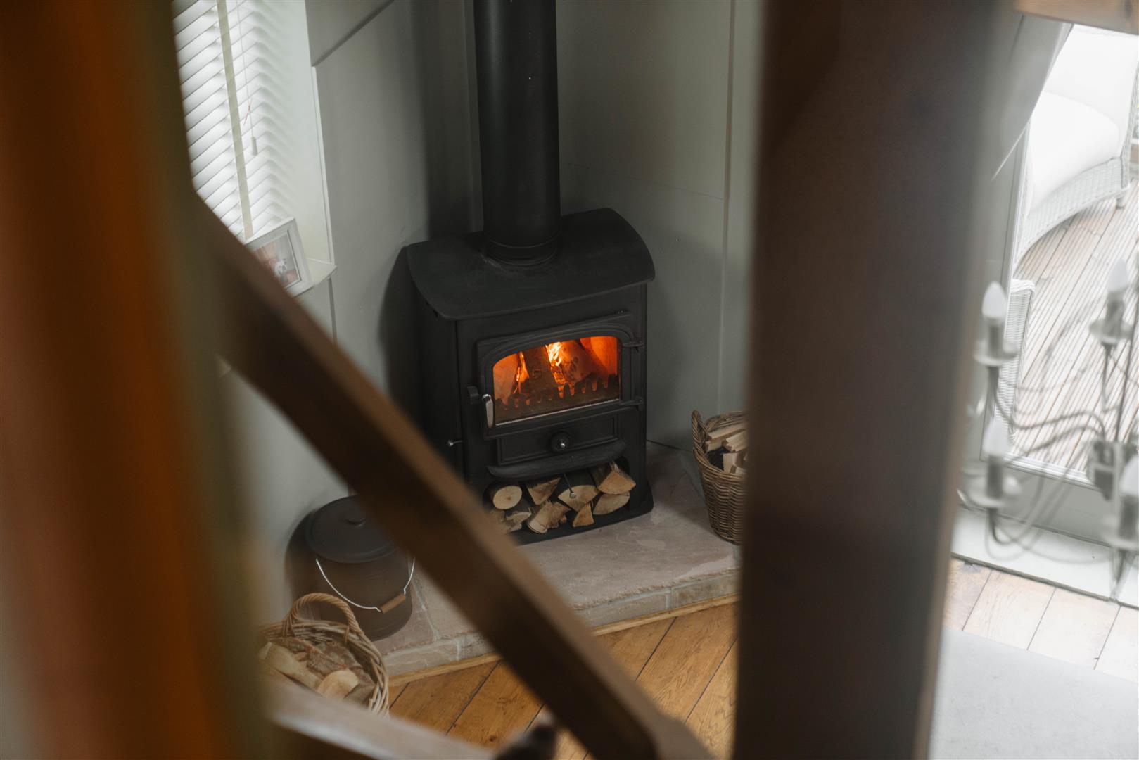 - Stunning vaulted ceiling lounge with exposed stone wall, oak beams, log burner and patio doors onto the decked terrace