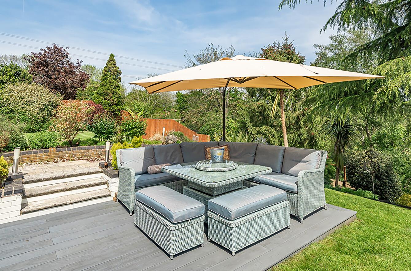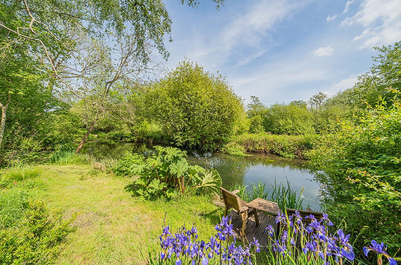 Rear Garden: - The rear garden is approximately 146' in length and commands outstanding views over the River Itchen Navigation Channel and water meadows. Adjoining the rear of the house is a full width paved patio and brick paved area, leading onto a Millboard deck with pizza oven providing outstanding entertaining spaces. Meandering pathways take you through tiered and well stocked borders with an abundance of mature shrubs and plants from top to bottom. A path leads to a raised partly covered deck which provides beautiful views over the river and at the very bottom of the garden is a further sitting area adjacent to the river.