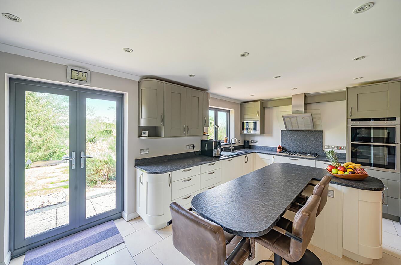 Kitchen/Breakfast Room: - 16'6" x 13'2" (5.03m x 4.01m) Re-fitted with a comprehensive range of grey and cream coloured shaker style units and measurement up to a range of wall to wall cupboards and recess for an American style fridge/freezer, Neff electric double oven, Bosch gas hob and extractor hood over, integrated Bosch dishwasher, Bosch microwave, island unit providing breakfast bar and seating for three, tiled floor with underfloor heating, double doors to rear garden.