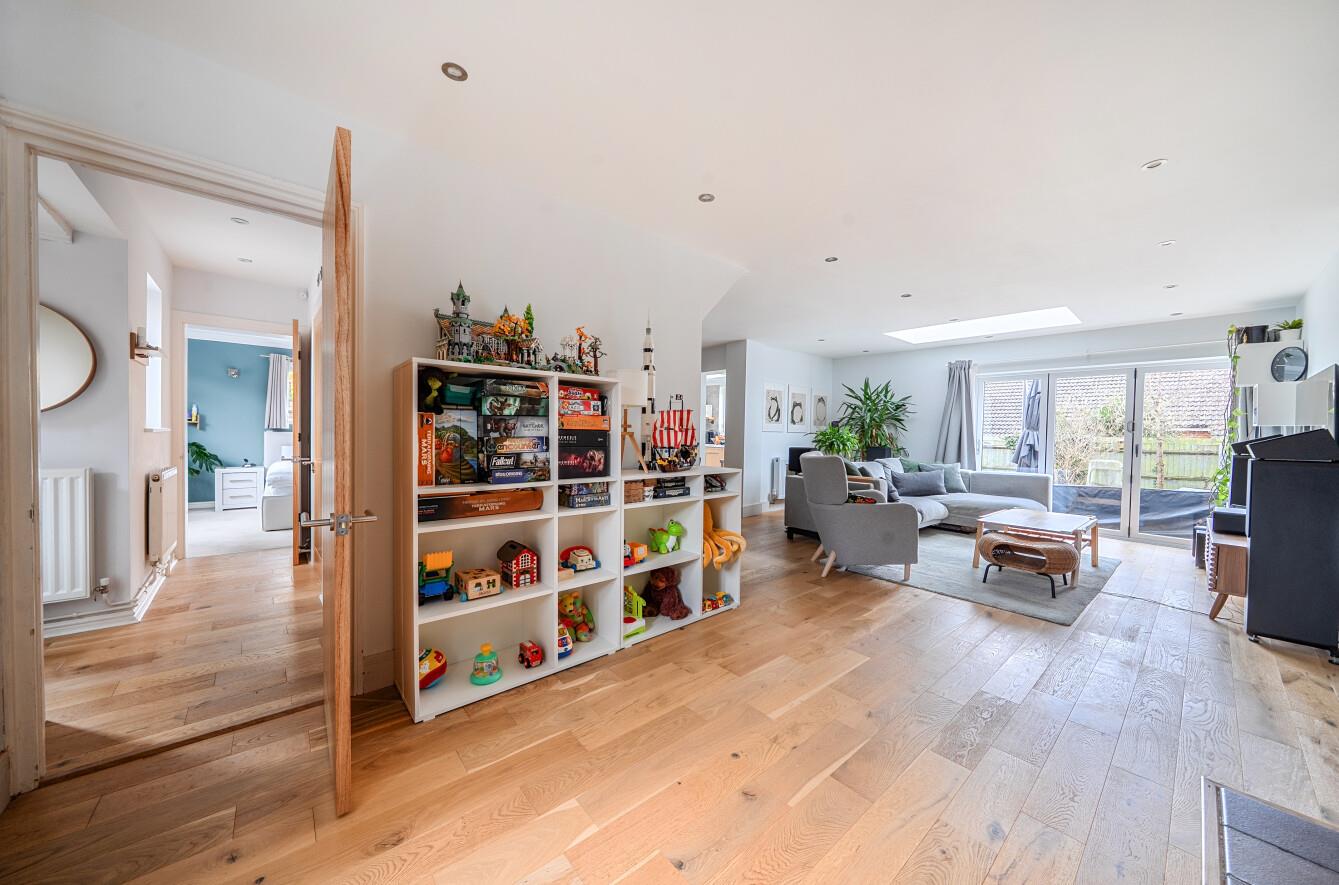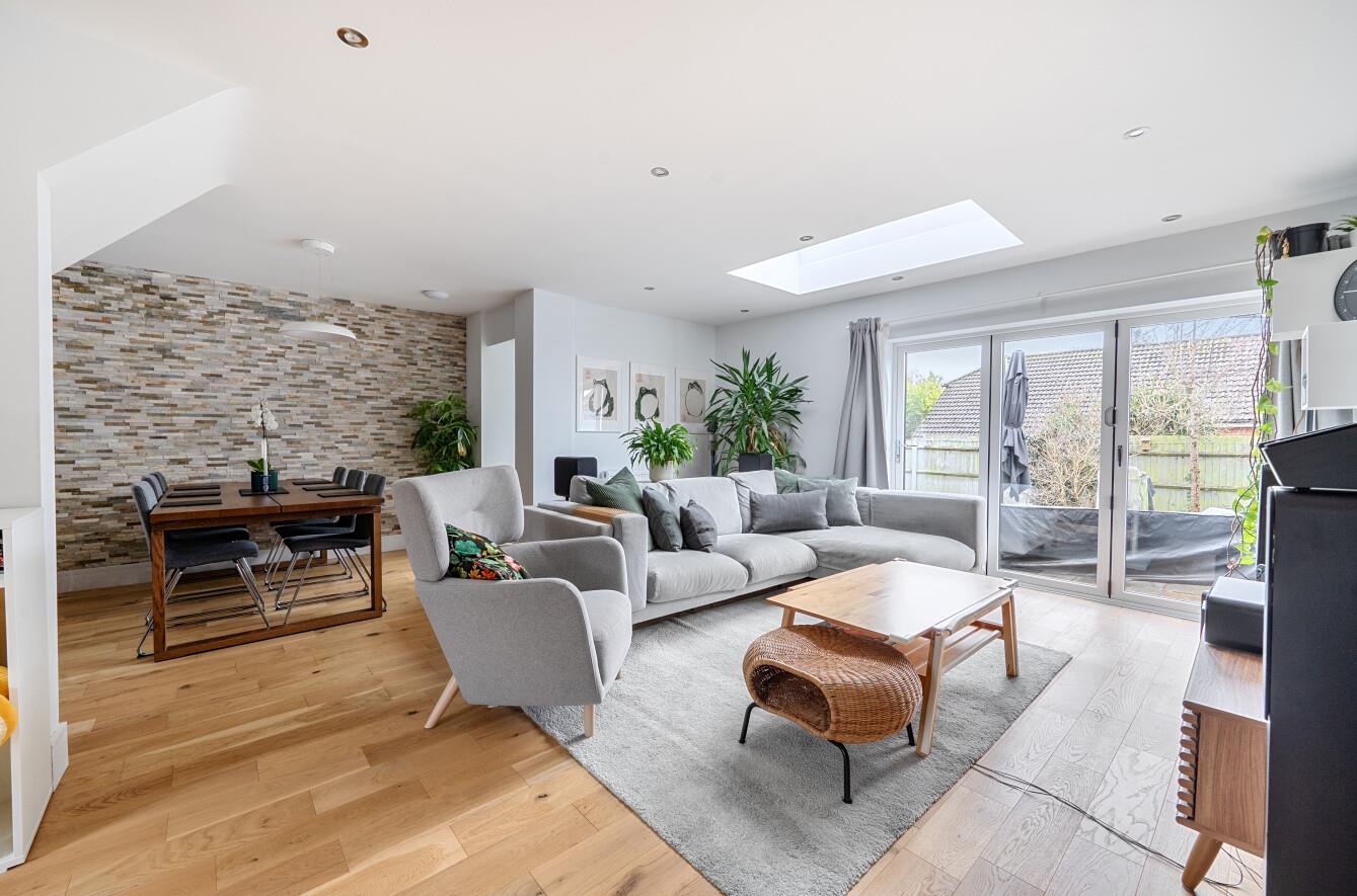 Sitting/Dining Room: - 25'4" x 21'2" (7.73m x 6.46m) This magnificent open plan space affords a study area with open fireplace and sitting area, space for sofas and bi-fold doors to rear garden with a dining area providing ample space for table and chairs and feature wall.