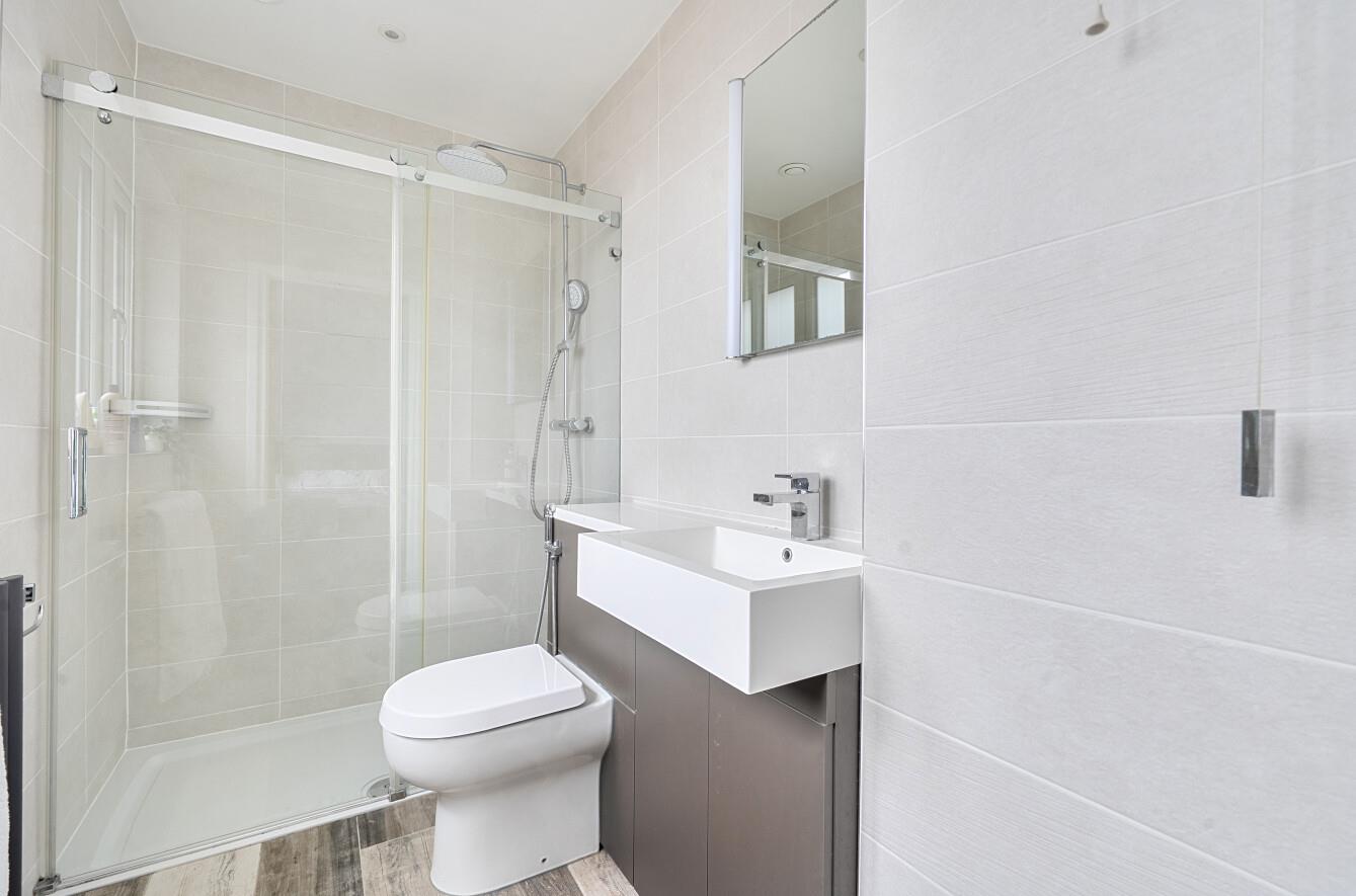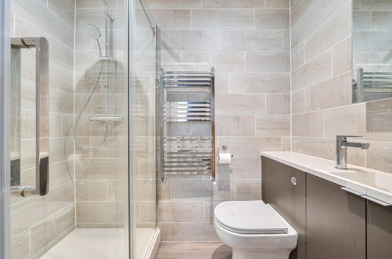 En-Suite Shower Room: - Re-fitted modern suite comprising double width shower cubicle with glazed screen, wash basin with cupboard under, WC, tiled walls and floor.
