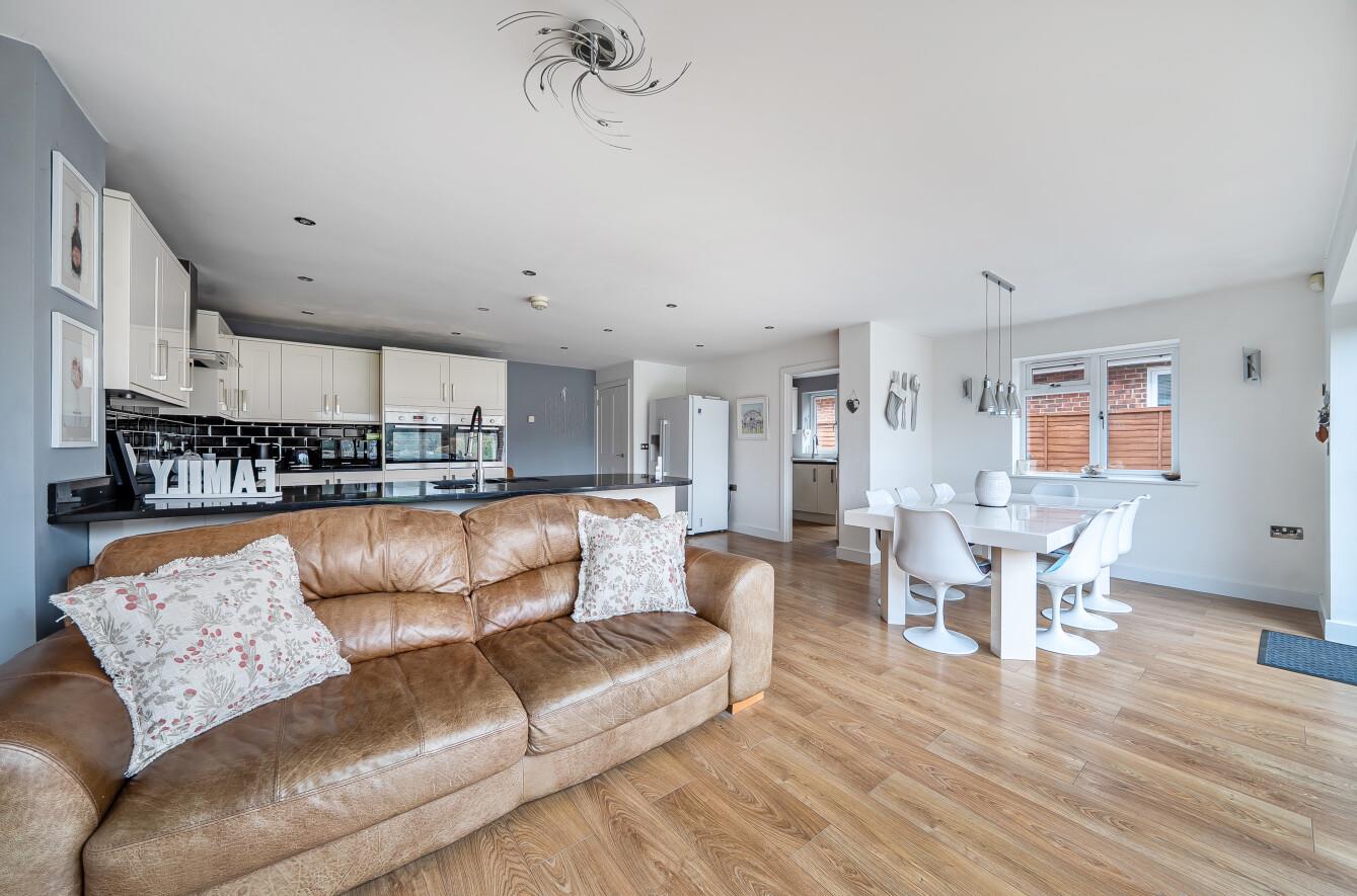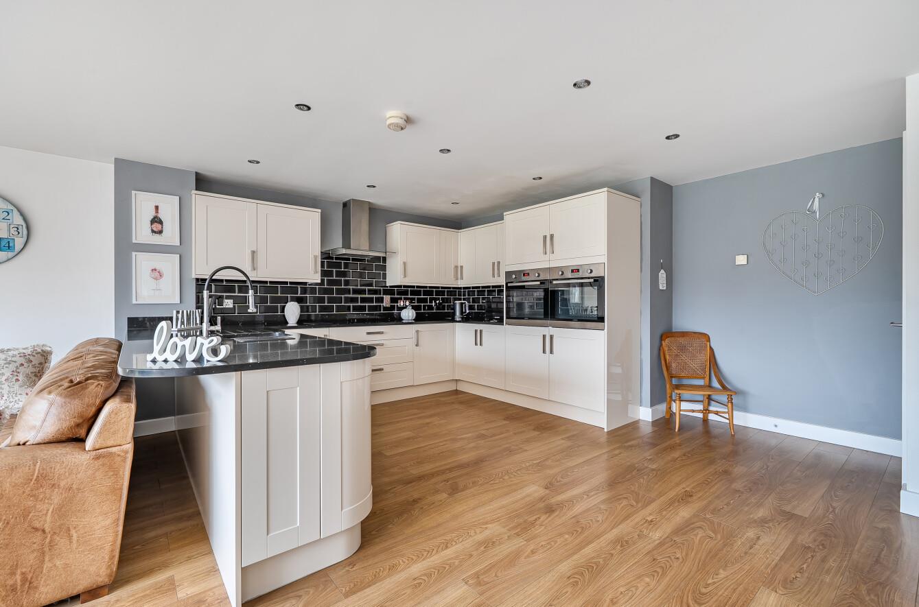 Kitchen/Dining/Living Room: - 22'6" x 21'1" (6.86m x 6.43m) The kitchen area is comprehensively fitted with a range of cream gloss shaker style units with granite worktops over, two electric ovens, induction hob with extractor hood over and integrated dishwasher. The dining area affords space for table and chairs and the sitting area has space for sofas with bifold doors to rear garden.