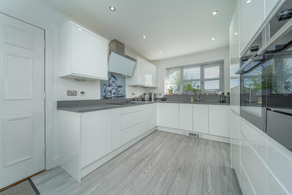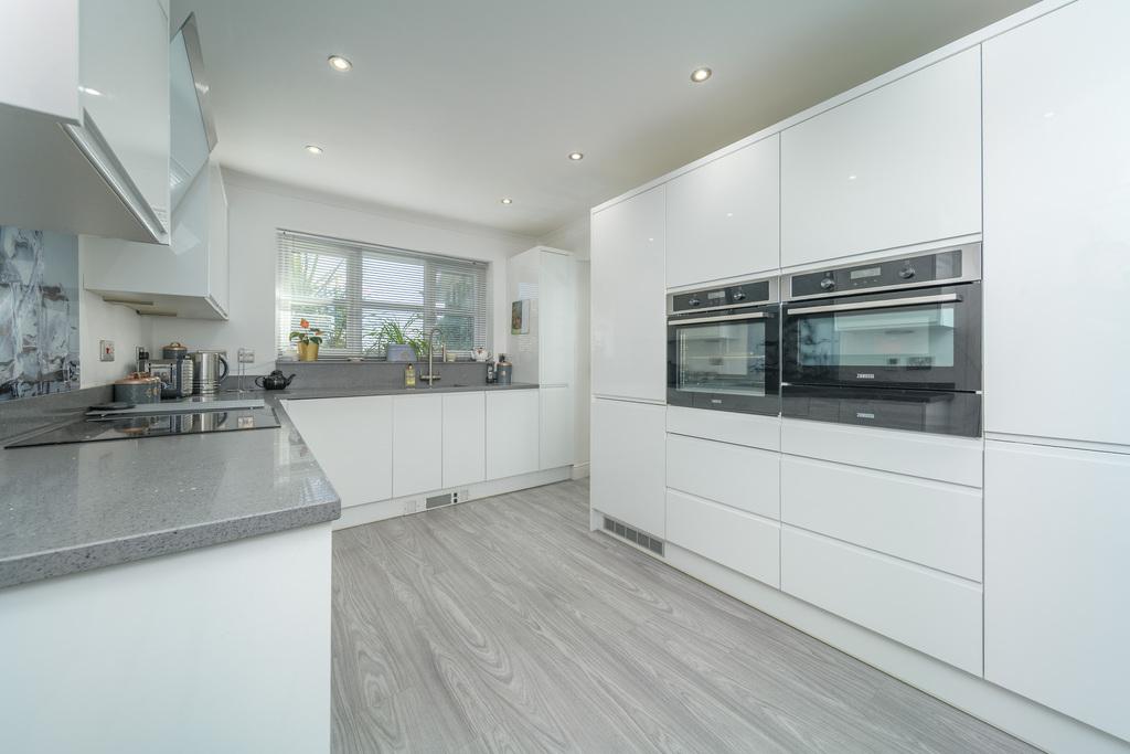The kitchen, with grey wood-look flooring, is dual aspect with a large window to the front and another to the rear both of which take advantage of the beautiful garden views. The recently fitted kitchen offers a good number of wall and base units with a white high gloss handless door complemented by a delicately sparkly grey granite work surface. In terms of fitted equipment, there is an AEG induction hob beneath a Faber designer-looking white glass and stainless-steel extractor fan, a superb range of pull out cupboards, a full sized Beko dishwasher, a bowl and a half Franke stainless steel sink, a fridge-freezer, a wine rack and two ovens one of which incorporates a warming drawer. The space is finished with an anthracite-coloured radiator and plenty of brushed chrome switches and sockets.