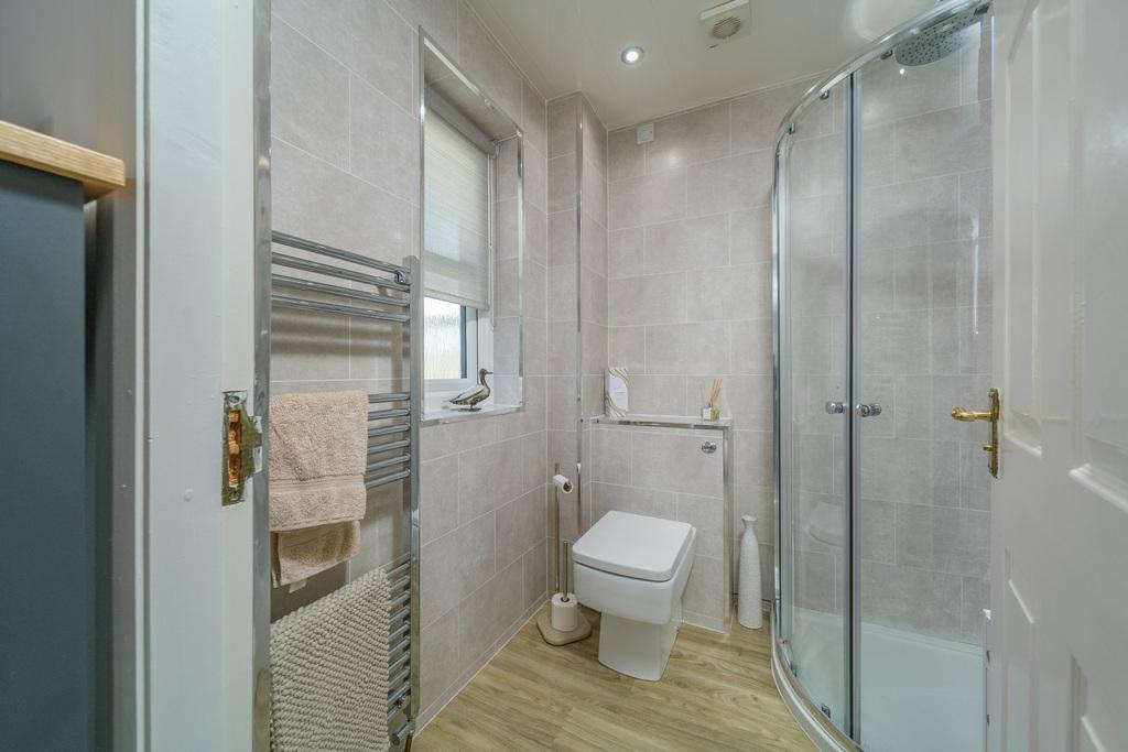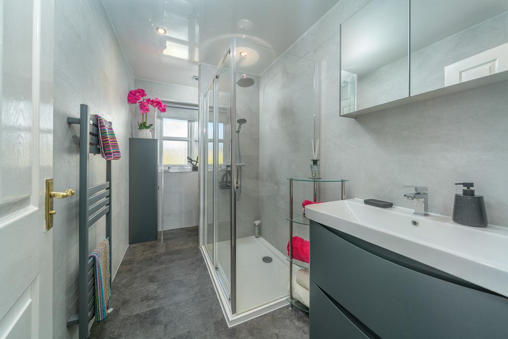 The family bathroom has been well designed and comprises a sizeable floor standing two drawer vanity unit with a large hand wash basin on top, a double sized shower cubicle, with a slimline tray and sliding doors, with a water fall shower head and a separate shower head within and a concealed cistern toilet with a push button behind. An anthracite-grey coloured heated towel rail ensures added comfort, there is a useful wall mounted cabinet, and a window to the rear allows for natural light which illuminates the dark marble-look vinyl flooring and tile-look wet walling creating a crisp and fresh finish.