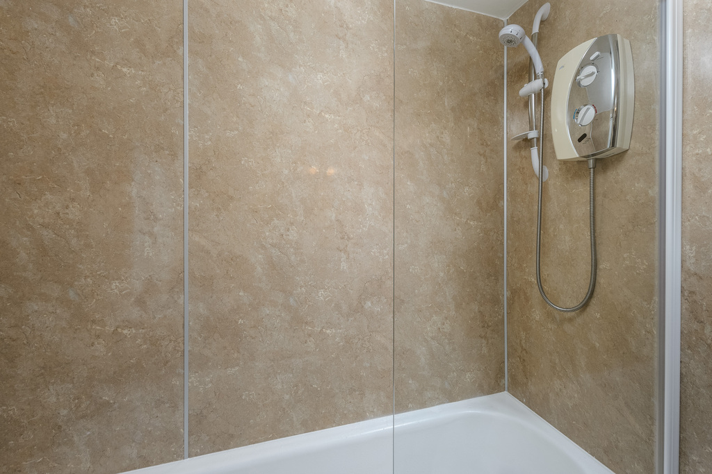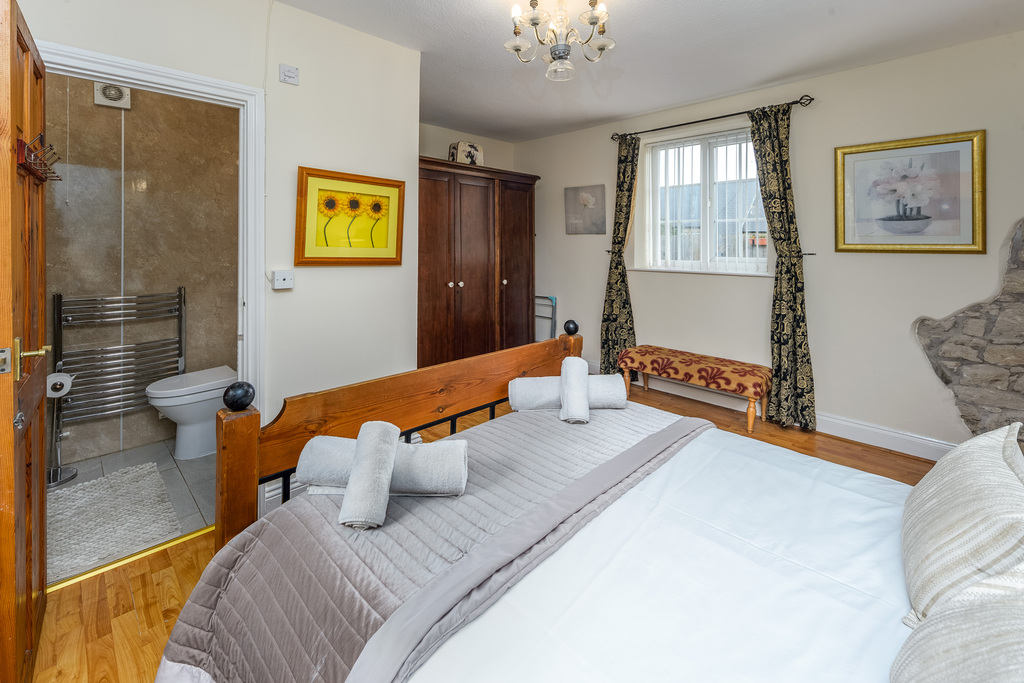 Generously proportioned and with high ceilings creating a greater sense of space, the second bedroom is a double room with ample provision for additional bedroom furniture. Natural light enters via a window overlooking the front garden. The ensuite, again encompassed with wet walling, comprises an electric shower over a bath behind a glass shower screen, a chrome heated towel rail, a vanity unit with a sink on top and a concealed-cistern toilet with a push button behind. A window allows for natural light and the space has been finished tastefully with stone-effect floor tiles.