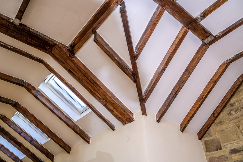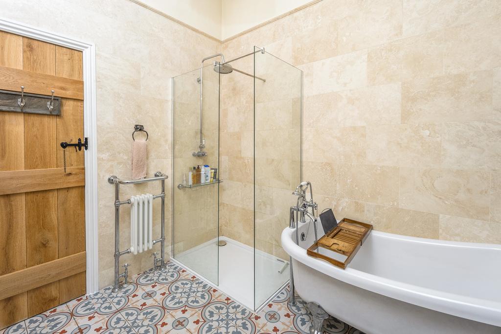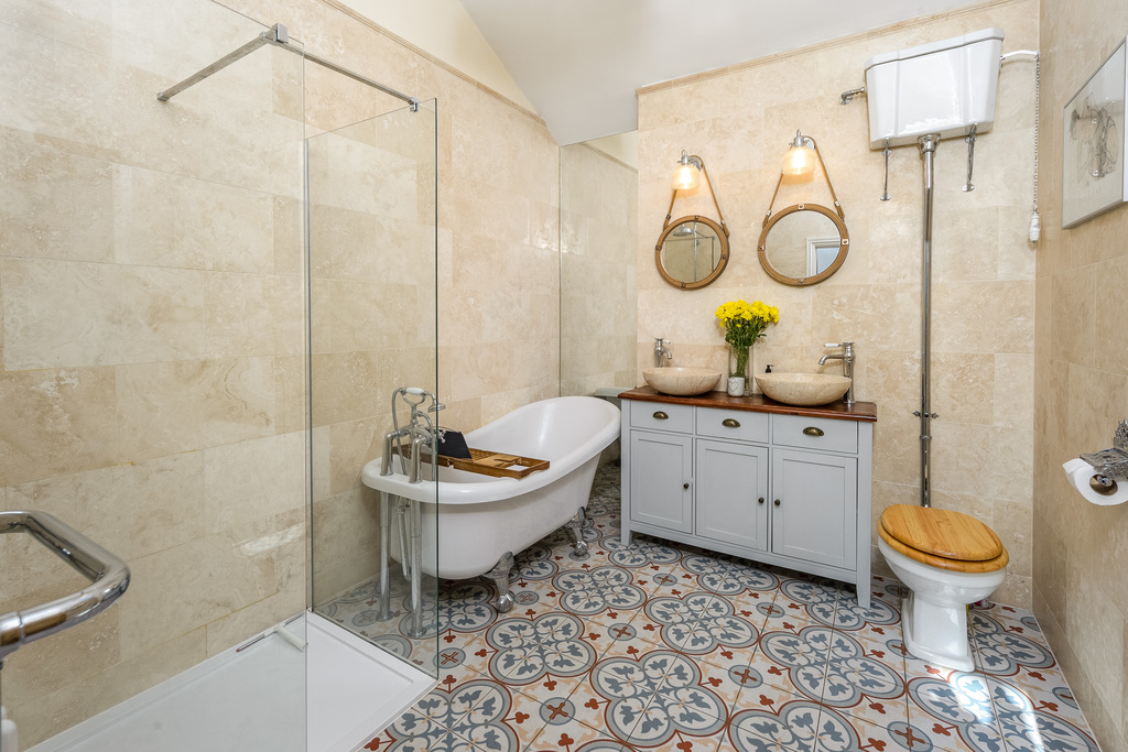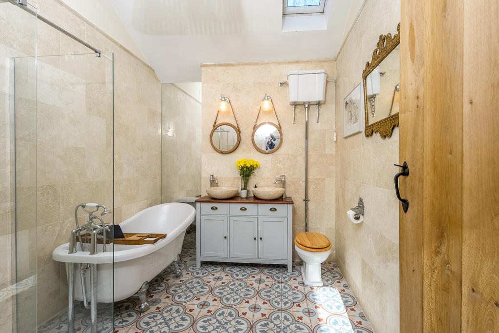 The bathroom, with underfloor heating, offers a wonderful bathing experience capturing the Victorian-style perfectly. There is double sized shower cubicle with a waterfall shower head within, an attractive claw-foot slipper bath with Victorian-style fittings, a high cistern toilet in keeping with the theme, an impressive radiator/heated towel rail and a two beautiful stone sinks on top of a vanity unit. The space has been finished with Victorian-style floor tiles and Travertine wall tiles and a recessed mirror enhances the space further in addition reflecting the natural light entering via the Velux window within the shaped ceiling.