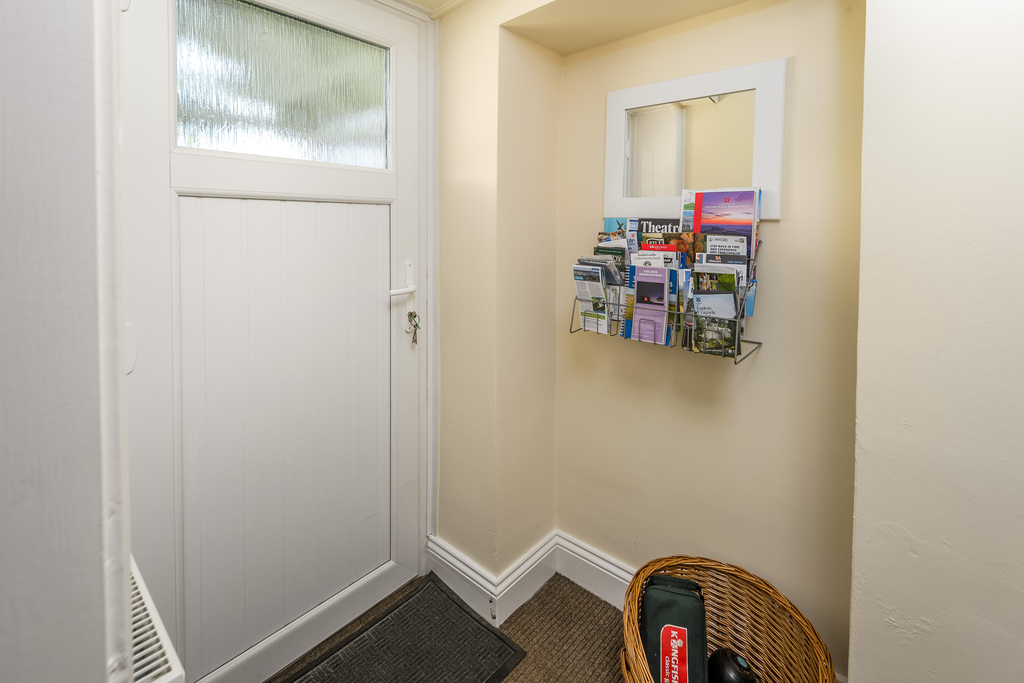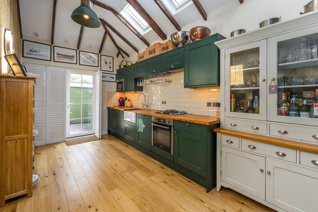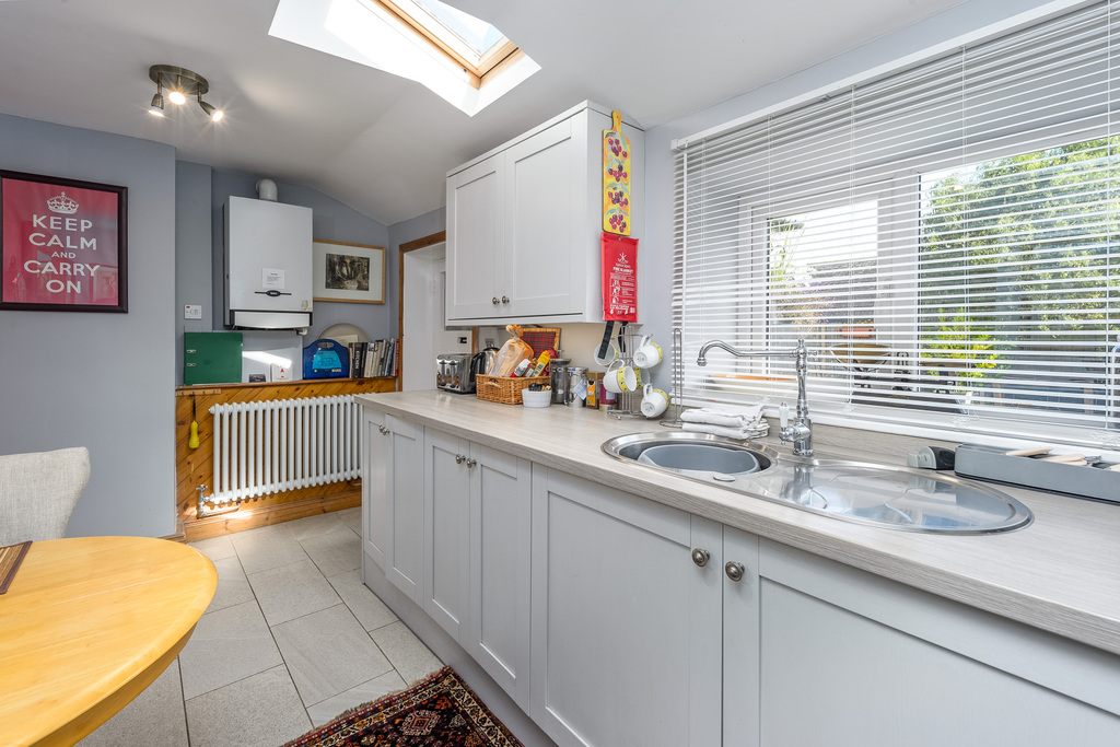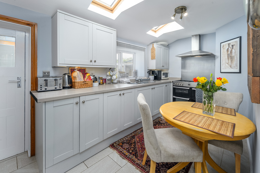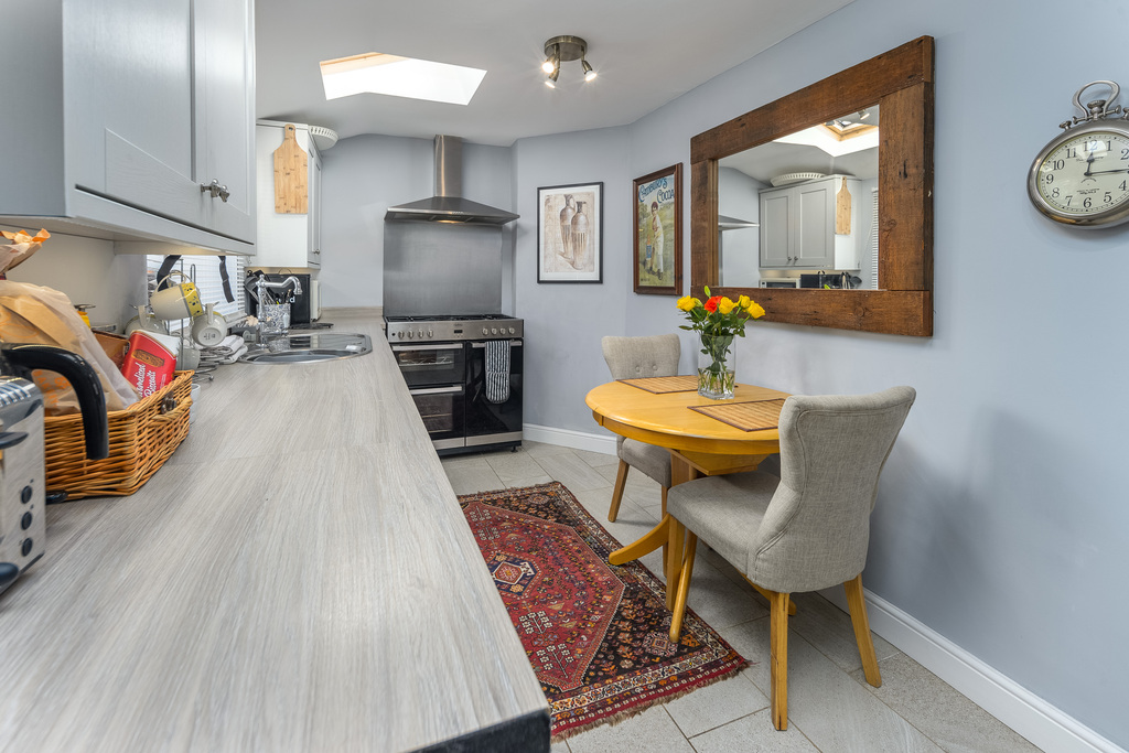 The kitchen is located at the rear of the property and has been upgraded to offer a good number of wall and base units with a shaker-style light grey door complemented by a wood-effect laminate work surface. There is a fridge, a dishwasher, a washing machine and a large Belling range cooker with a five-burner hob. The boiler is housed in the kitchen for ease of access and there is plenty of space to sit and dine. Bathed in natural light courtesy of two Velux windows and a window to the rear, this is a lovely space in which to create culinary delights. A Victorian-style radiator ensures added comfort. Adjacent there is a further porch area which currently houses a drinks fridge and where there is a door providing external access to the rear of the property.