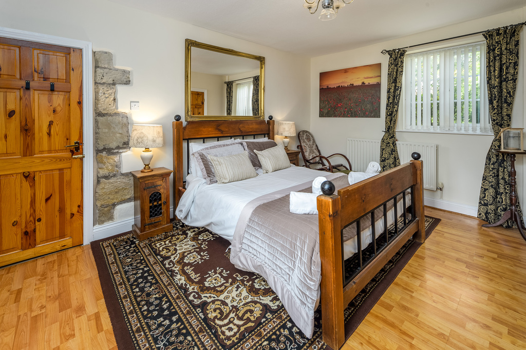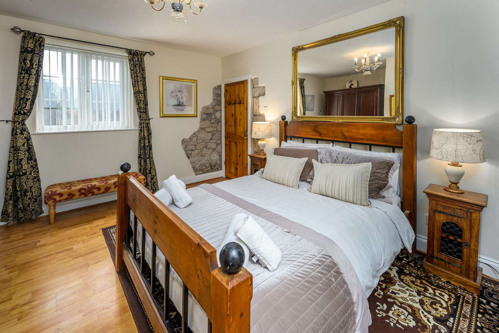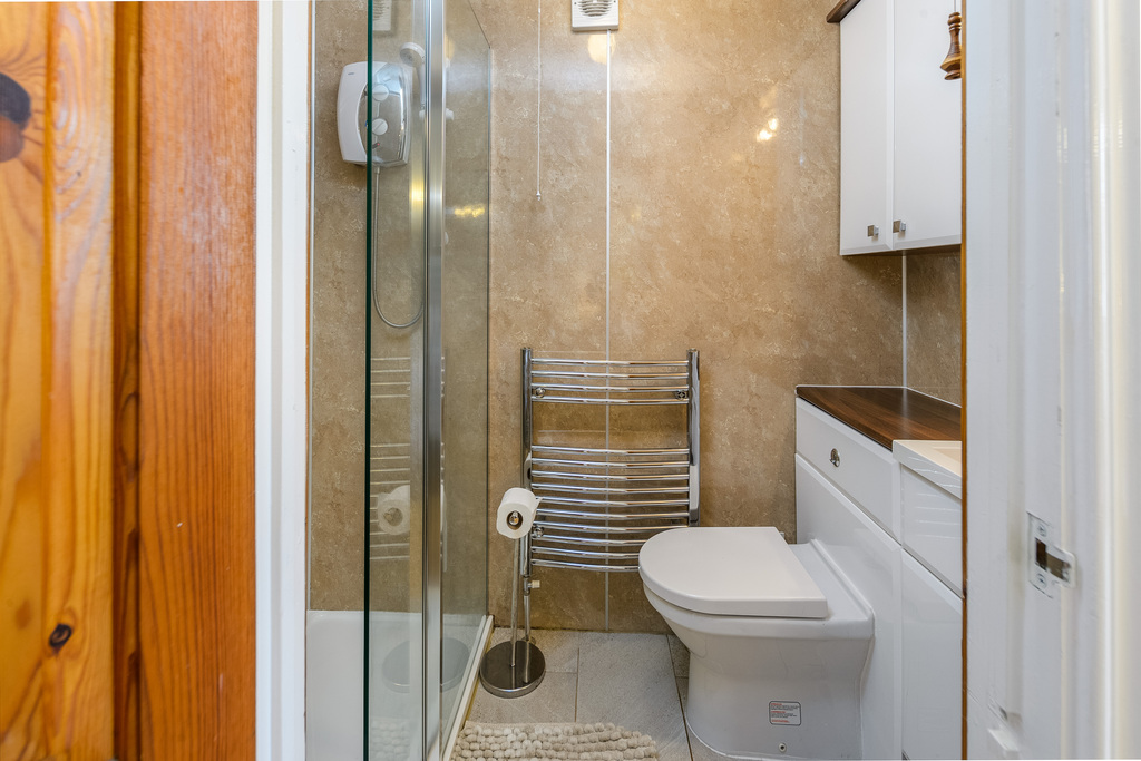 The primary bedroom, with the same laminate flooring as the lounge creating a seamless transition between the different spaces, is a spacious double room. Full of charm and character, and with a combination of exposed stone and plaster walls, this room is wonderfully relaxing. A recessed area adds to the attraction and offers further substantial storage space. A window overlooks the front of the property. The ensuite, encompassed in wet walling, comprises a double-sized shower cubicle with an electric shower within, a chrome heated towel rail, a vanity unit with sink on top and a concealed-cistern toilet with a push button. There is wall mounted mirror and storage, and stylish floor tiling completes the room.