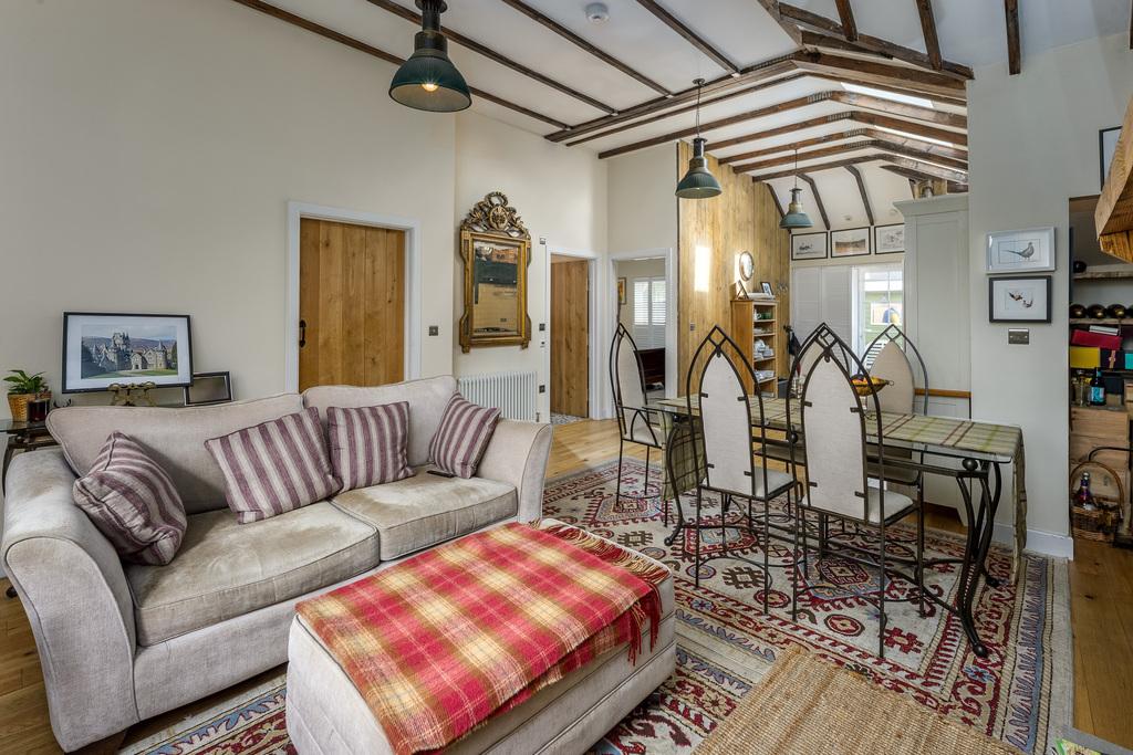 A paved area adjoining the lawn presents a lovely sitting area and offers a warm welcome as you approach the front of this property. A uPVC door opens to a useful entrance porch with engineered oak flooring, exposed stone walls and a good number of windows allowing plenty of natural light. A door opens from here to a glorious open plan living-dining-kitchen space and you are immediately impressed by the high ceilings and sense of space: completely unexpected and delightful in its size.