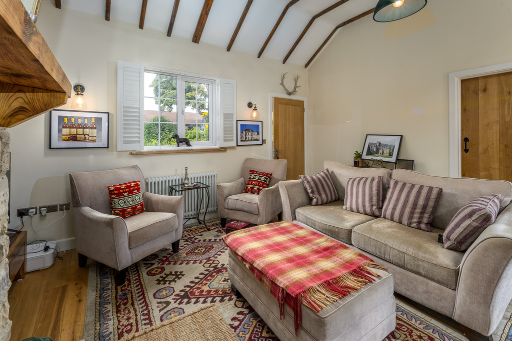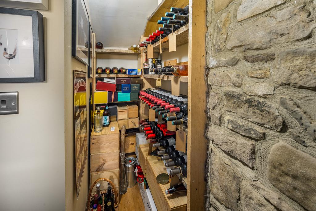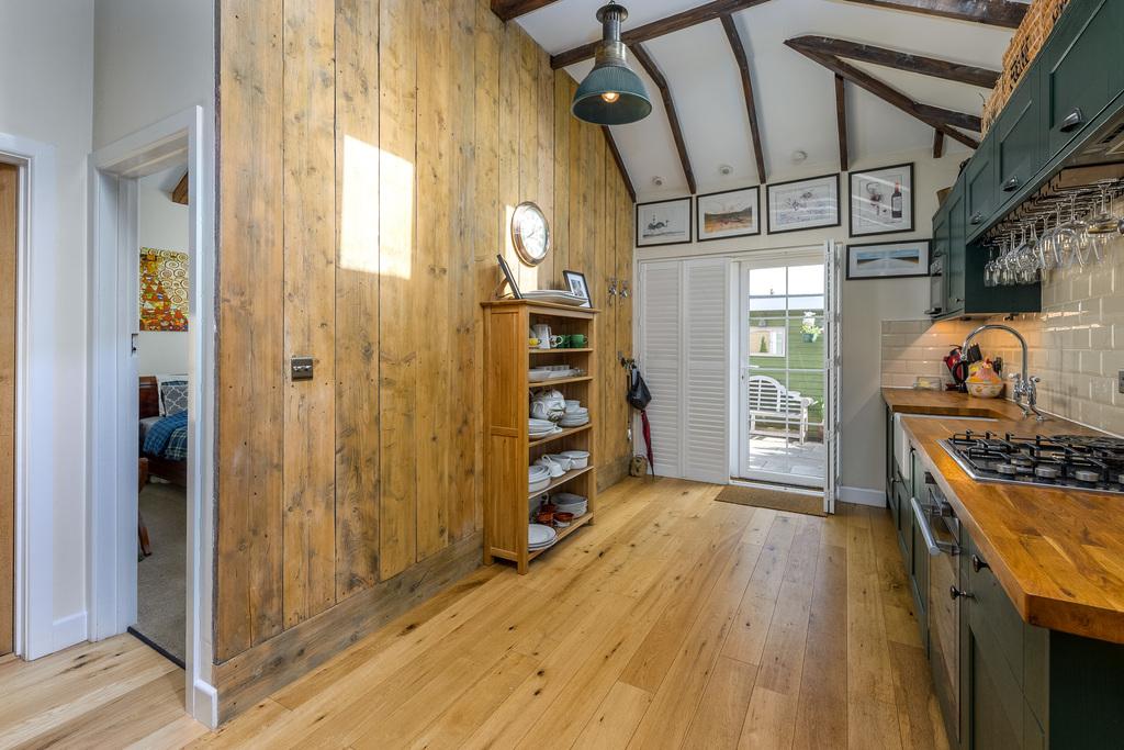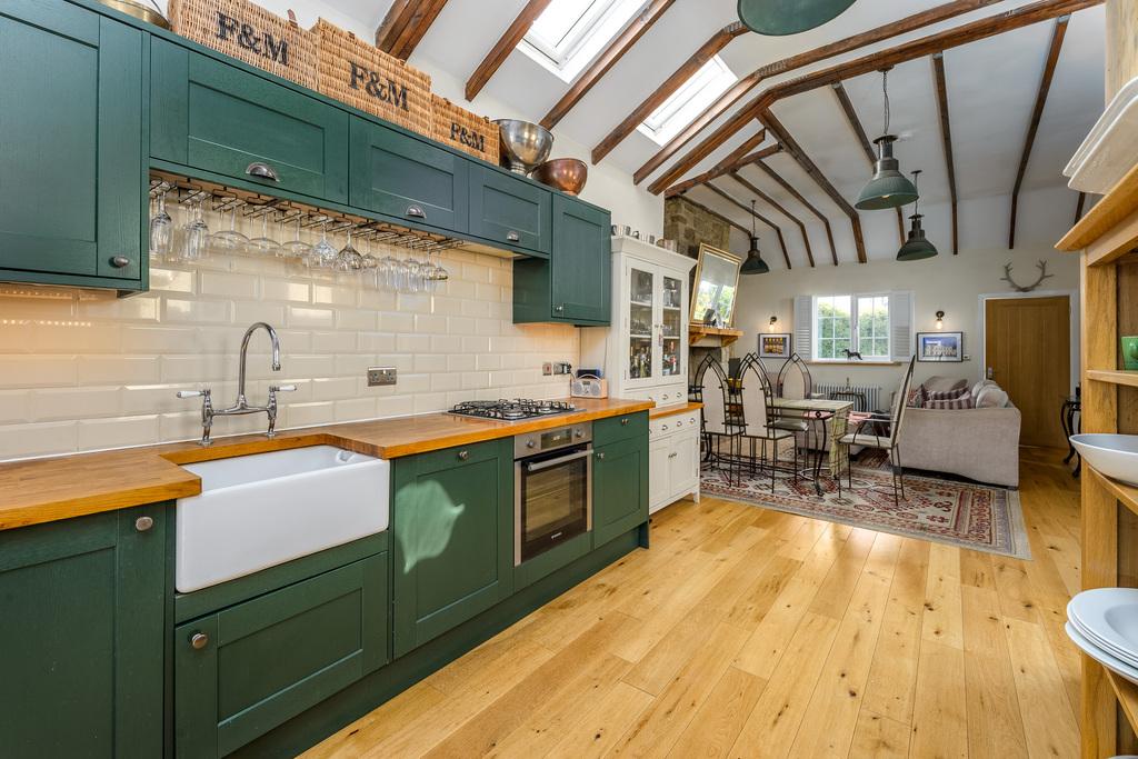 The open plan living space has been imaginatively designed to create stylish light and bright living whilst maintaining the lovely country cottage charm. The inglenook fireplace with a stone hearth and surround is a superb focal point within the lounge which is a wonderful and inviting space. The light fittings enhance the space perfectly which then flows effortlessly into the dining area which then leads to the kitchen. There are a good number of wall and base units with a green shaker style door complemented by a wood beech block work surface. The Baxi combi boiler is housed in the kitchen for ease of access and there is a four burner gas hob, an under bench oven, a Belfast sink with a Victorian style tap above, a glass storage fixture and a free standing dresser. In addition, there is a Gorenje dishwasher, a fully integrated fridge and an integrated washing machine. Located in a recess behind, a wine cellar forms a charming feature. A pair of French doors with colonial shutters allow a tremendous amount of natural light to illuminate the space beautifully.