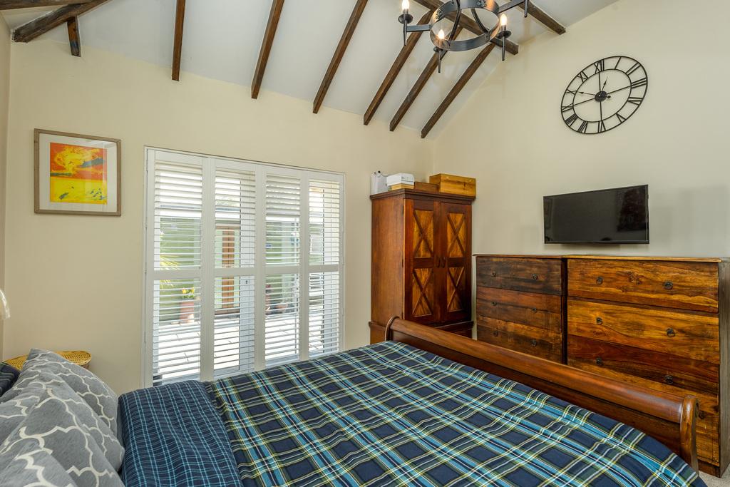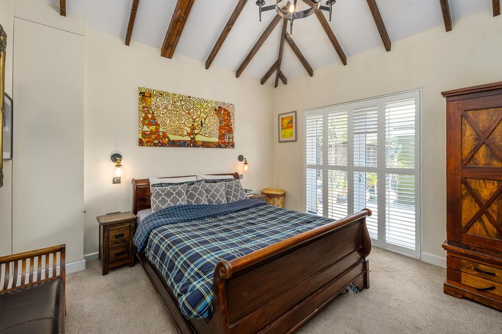The primary bedroom, with vaulted ceiling and French doors opening to the rear of the property, is a stunning double room which easily accommodates a range of additional bedroom furniture. A lovely and relaxing room with underfloor heating and a sumptuous carpet adding further comfort as you move throughout.