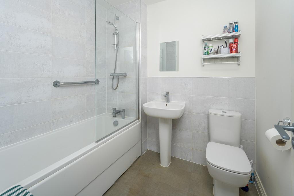 The bathroom comprises a bath with a shower over behind a pivot glass door, a pedestal hand wash basin, a close coupled toilet with a push button flush, an extractor fan and a chrome heated towel rail ensures added comfort. The space is finished with pale grey tiling, complementing the white paintwork, which creates a crisp and fresh finish.
