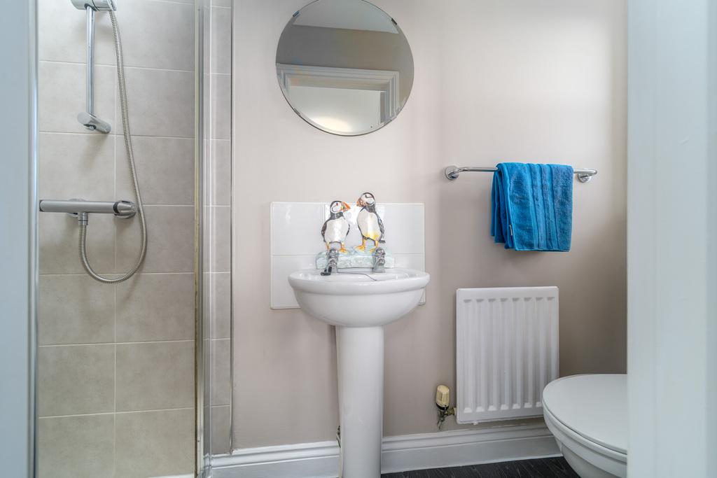 The principal bedroom is a spacious double room, with fitted wardrobes and a window taking advantage of views to the rear. The en-suite comprises a shower cubicle, a pedestal hand wash basin with wall mounted mirror above, a close coupled toilet with a push button behind and a towel rail. The space is finished with vinyl flooring and attractive tiling.