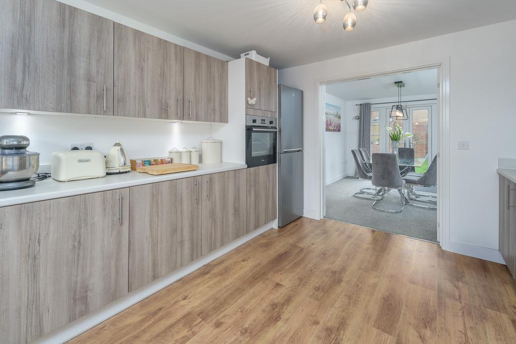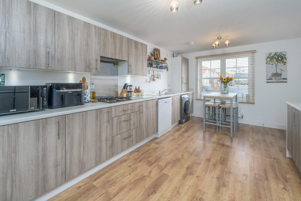 Well-equipped and gloriously light and bright, the kitchen is a superbly sociable space overlooking the front of the property. There are a good number of wall and base units with a light-coloured wood-look door complemented by a light wood-effect work surface with matching upstand. There is a bowl and a half stainless steel sink, a four-burner gas hob beneath a built-in extractor fan, an eye level oven, and spaces for a free-standing fridge-freezer, a free-standing dishwasher and a free-standing washing machine. The gas boiler is housed in a cupboard for ease of access and wood-effect LVT flooring completes the look practically and stylishly.