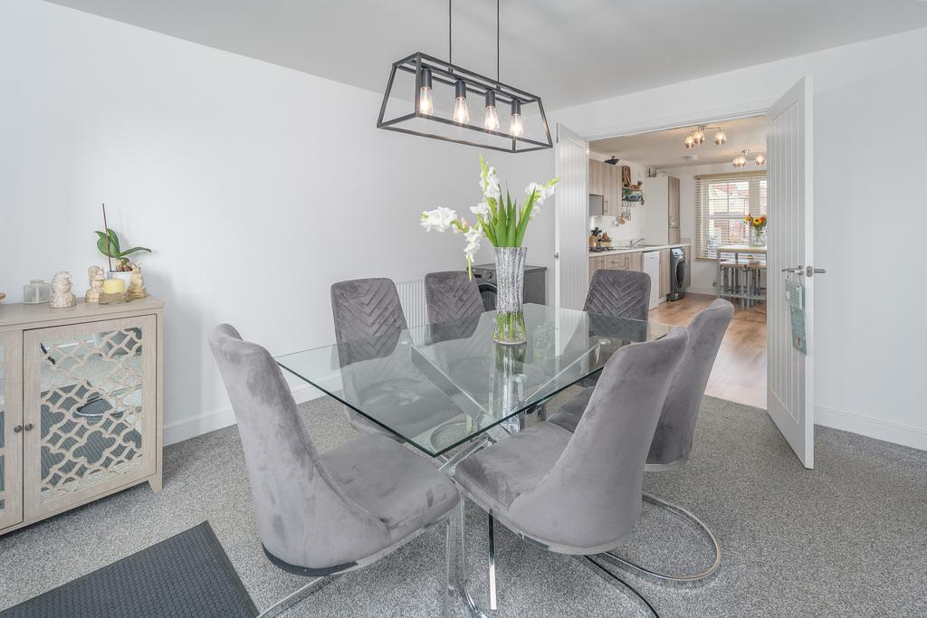 A pair of French doors open to the dining room which is furnished with a sumptuous grey carpet. French doors with glass panels to either side lead out into the rear garden allowing a tremendous amount of natural light in addition to forming a seamless transition between indoor and outdoor living. There is plenty of space to sit and dine whilst appreciating the garden views. A connecting door opens into the lounge.