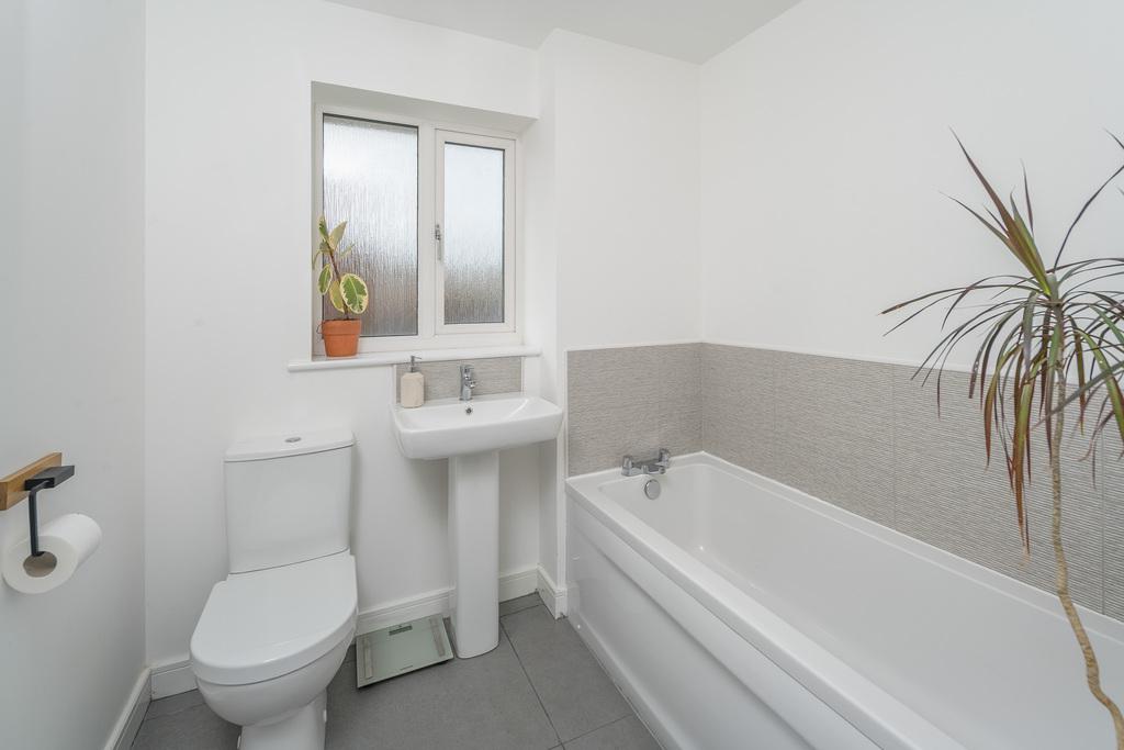 The family bathroom comprises a white bath, a pedestal wash hand basin, a close-coupled toilet with a push button and a window to the rear allowing for natural light. The space is finished with large grey floor tiles which work in harmony with the beige-grey tiling surrounding the bath establishing a sleek and stylish look.