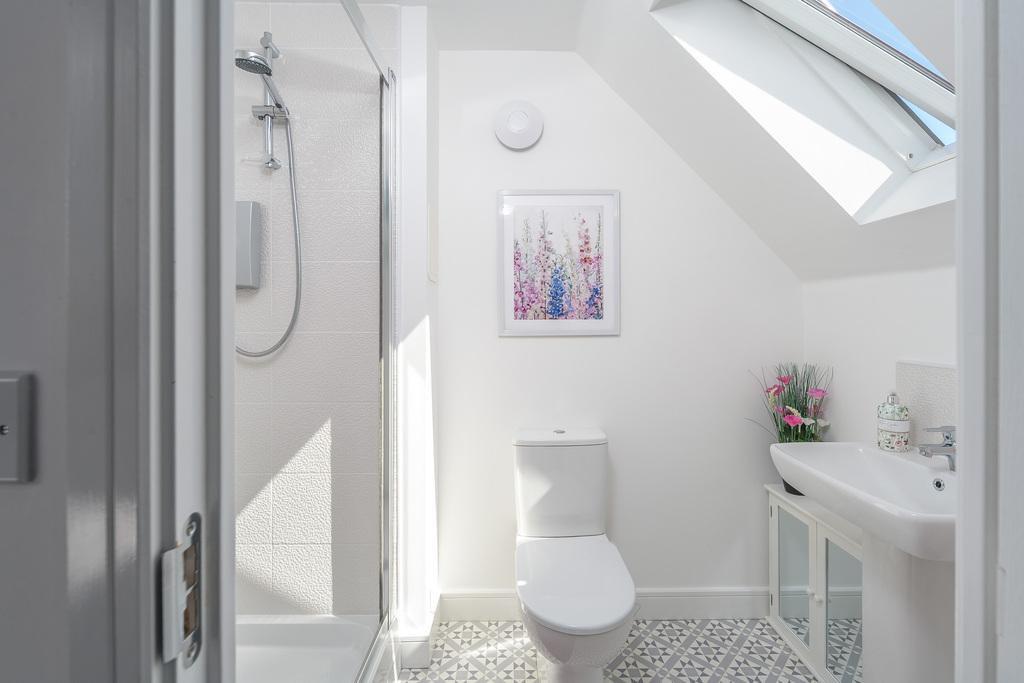The family bathroom, with attractive cushioned flooring, is a good size comprising a white bath, a pedestal wash hand basin and a close coupled toilet with a push button. The space has been finished with a grey tiling which which creates a crisp and fresh look.