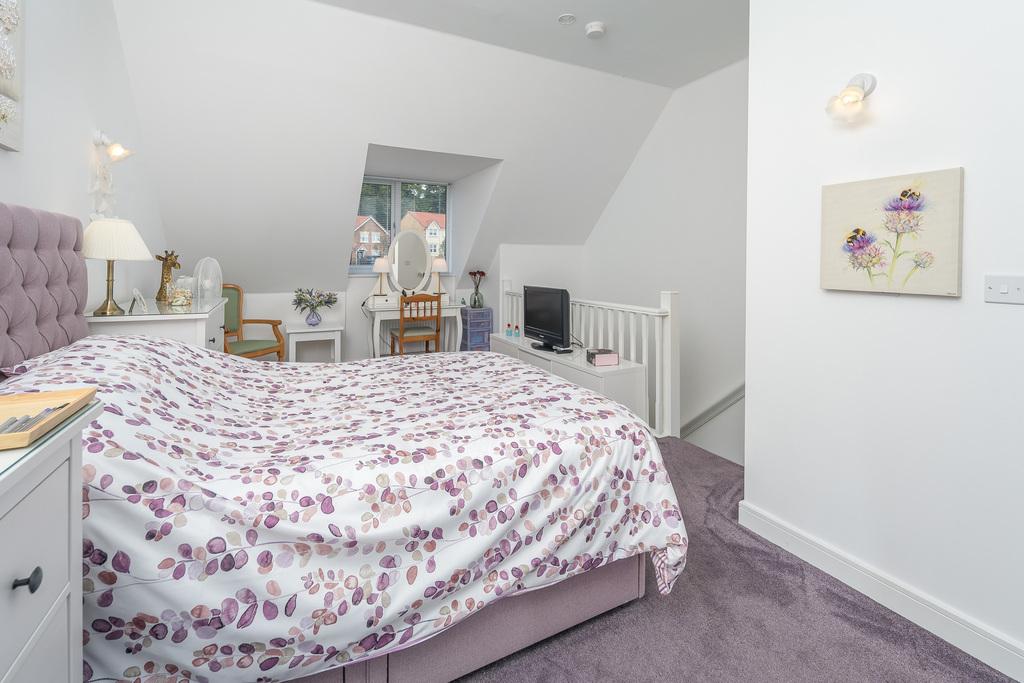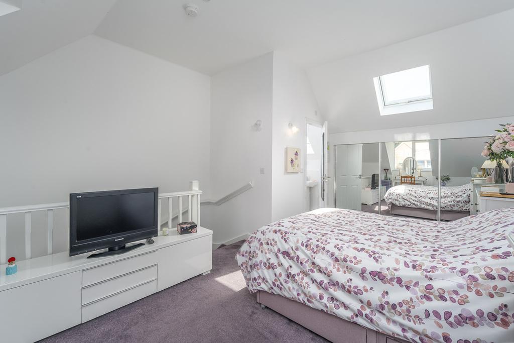 The primary suite is located on the second floor and is a haven of peace and tranquillity being further removed from the main hub of the home. This light and bright bedroom is a large double with a semi-vaulted ceiling and a large window to the front with far reaching views. A Velux window opposite allows further natural light to enter. There is a bank of built-in mirrored sliding door wardrobes and to the other side there is a fabulous en-suite. This space has been furnished with flooring matching that of the family bathroom and comprises a double sized shower cubicle with a sliding door and an electric shower within, a close coupled toilet with a push button and a pedestal wash hand basin. A Velux window within the semi-vaulted ceiling allows for natural light. The walls have been finished with slightly embossed tiling which completes the look perfectly.