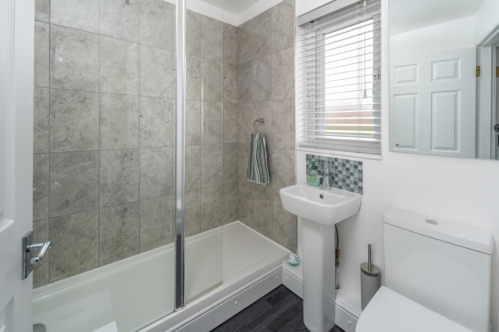 The family bathroom comprises a fully tiled double sized shower cubicle with a thermostatic waterfall showerhead and a separate showerhead within, a pedestal hand wash basin with a mixer tap and mosaic tiled splash back behind, a wall mounted mirror and a close coupled toilet with a push button. A chrome heated towel rail ensures added comfort. The space is finished with black vinyl floor and a window with privacy glass overlooks the rear of the property.