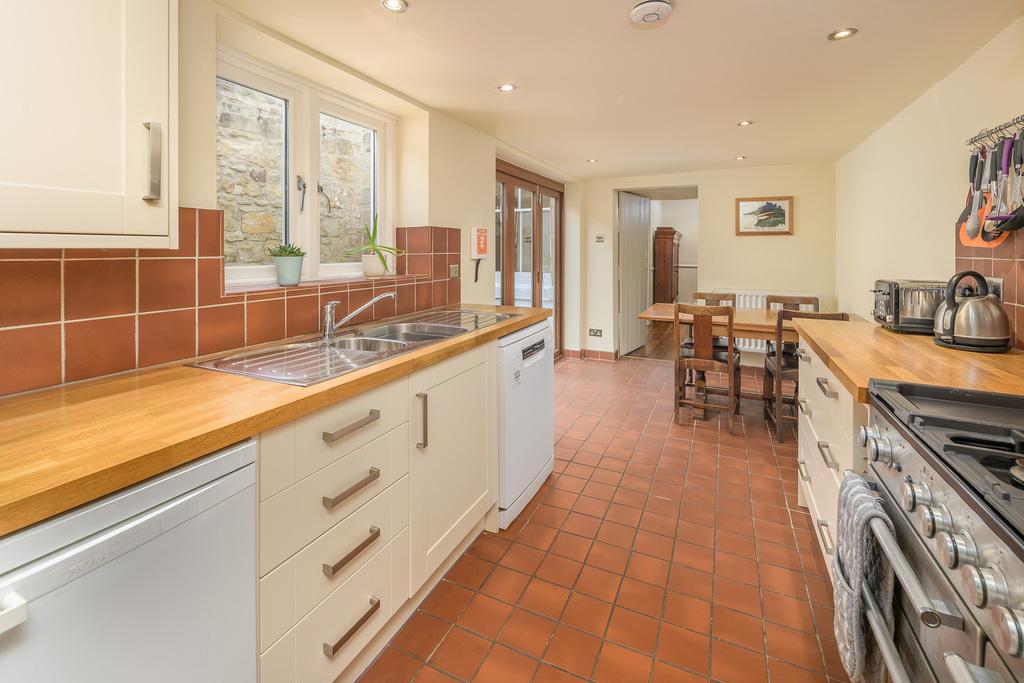 Located at the rear of the property, the kitchen is a glorious light and bright space with bi-fold doors opening to the rear courtyard facilitating free flow of movement between indoor and outdoor living. There is plenty of space to dine whilst appreciating the pretty courtyard views. The kitchen offers a good number of wall and base units with a shaker style door complemented by a solid wooden work surface which incorporates a bowl and a half twin drainer sink below a window which captures views of the attractive raised planters within the courtyard. There is space for a large range cooker beneath an extractor fan, two further under bench appliances and space and plumbing for a dishwasher. The room is finished practically with a quarry tiled floor matching the tiled splash back. Additional lighting is by way of ceiling spotlights and the brushed chrome switches and sockets add an attractive finishing touch.
