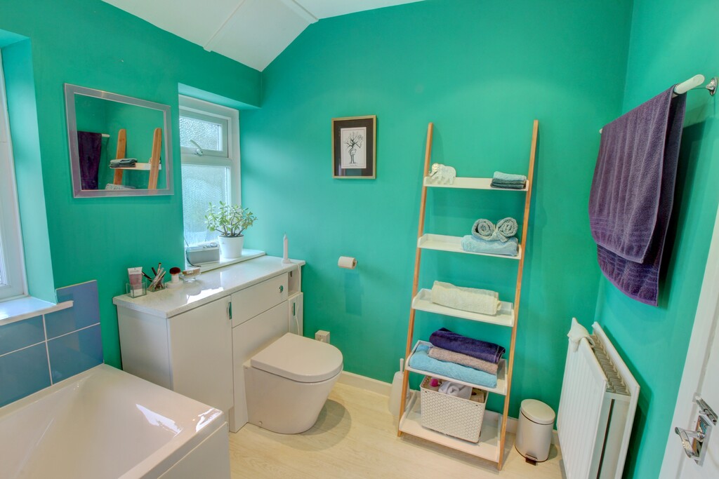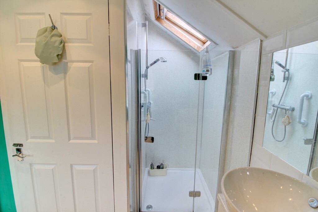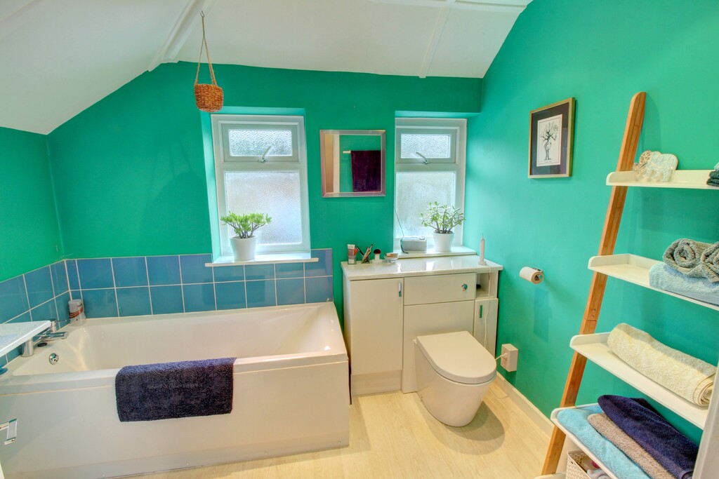 The family bathroom, with shaped ceiling, has been upgraded. There is a large white bath with a tasteful blue tile surround, a white vanity unit with a round bowl sink on top and further work surface to the side and a built-in mirror above with white brick-style splashback tiling around. A pivot door opens into a shower cubicle with a slimline shower tray and there is a concealed cistern toilet with a push button set into a white unit with a sparkly white work surface. A Velux window above the shower and two further windows allow for natural light.
