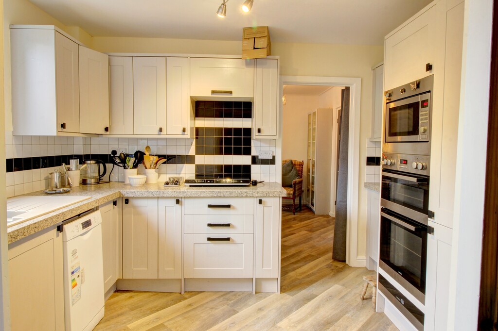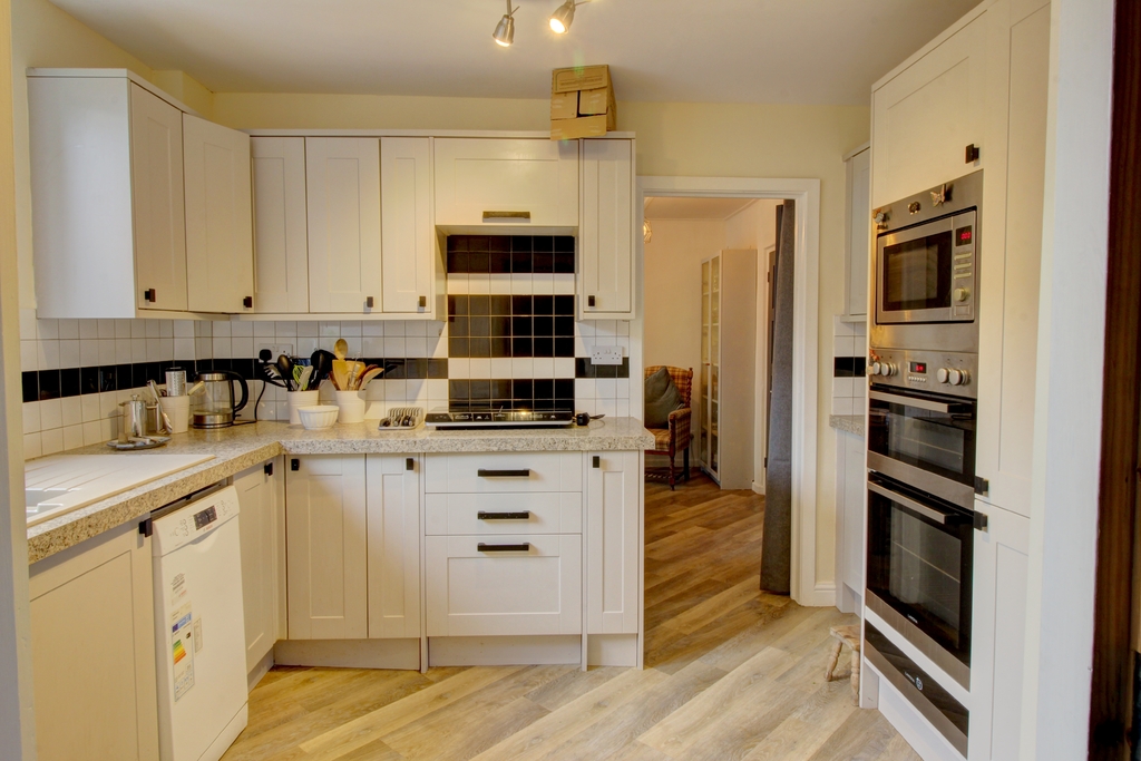 The kitchen, which leads from the dining room, offers a good number of wall and base units with a shaker-style door and modern black door furniture complemented by an attractive work surface and neutral splashback tiling. There is a Reginox resin sink, plumbing and space for a slimline dishwasher and a built-in microwave with an oven and grill below. This kitchen offers a superb number of additional storage cupboards and larder units. A wood and glass door opens to the garage, with an up and over door, which has a window to the rear and a door providing access to the rear garden. The gas boiler is housed in the garage for ease of access.