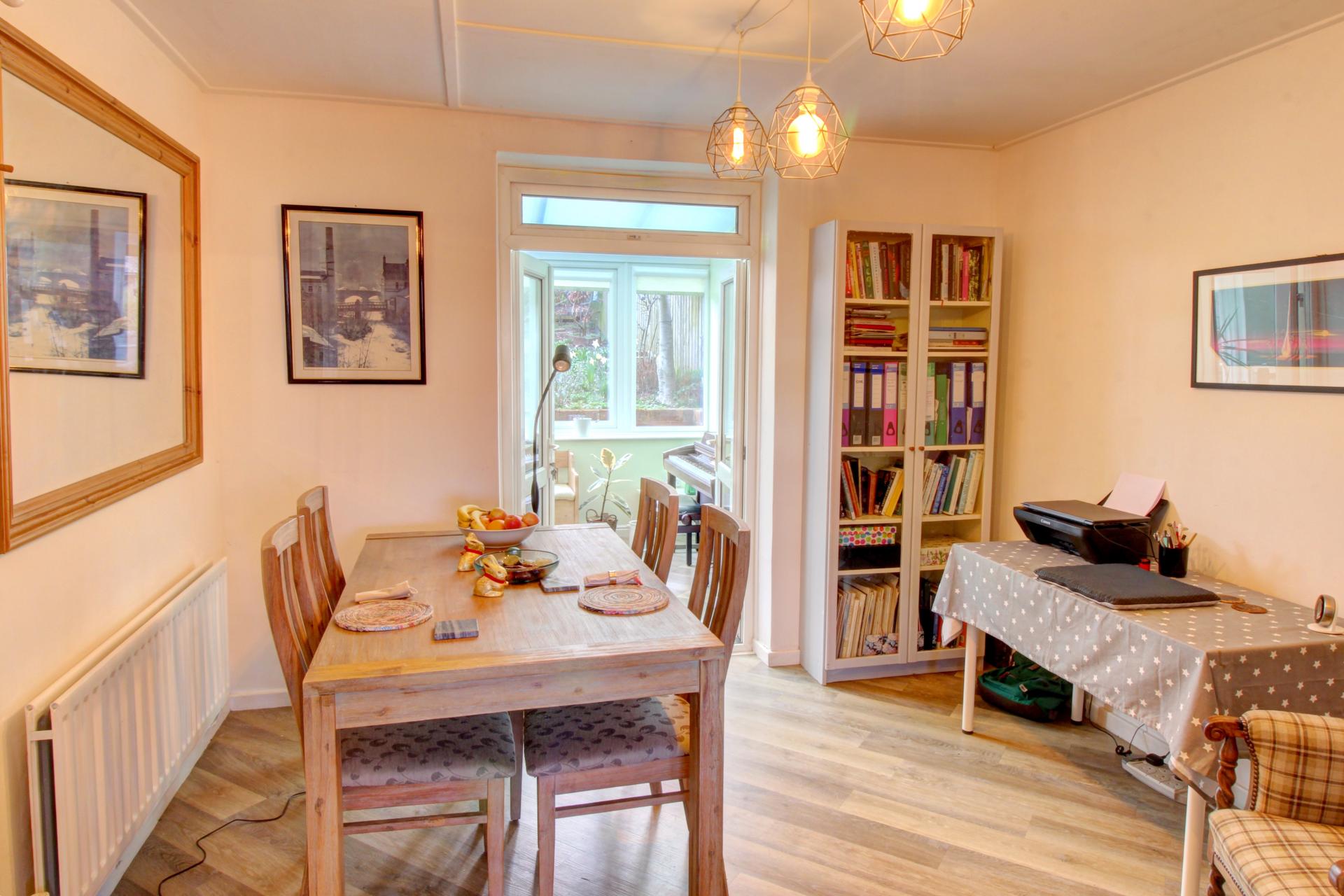 The lounge is gloriously light and bright courtesy of a large bay window overlooking the front of the property. The elevated views over the town captured from the window adds to the sense of space offered by this comfortable and neutrally decorated room. The gas feature fireplace forms an attractive focal point, and a pair of grey painted French doors lead into the dining room. The Karndean flooring furnishes both spaces allowing your eye to flow freely between the rooms. The dining room, with French doors opening to the conservatory and a door leading to the kitchen, is a lovely place to sit and dine.