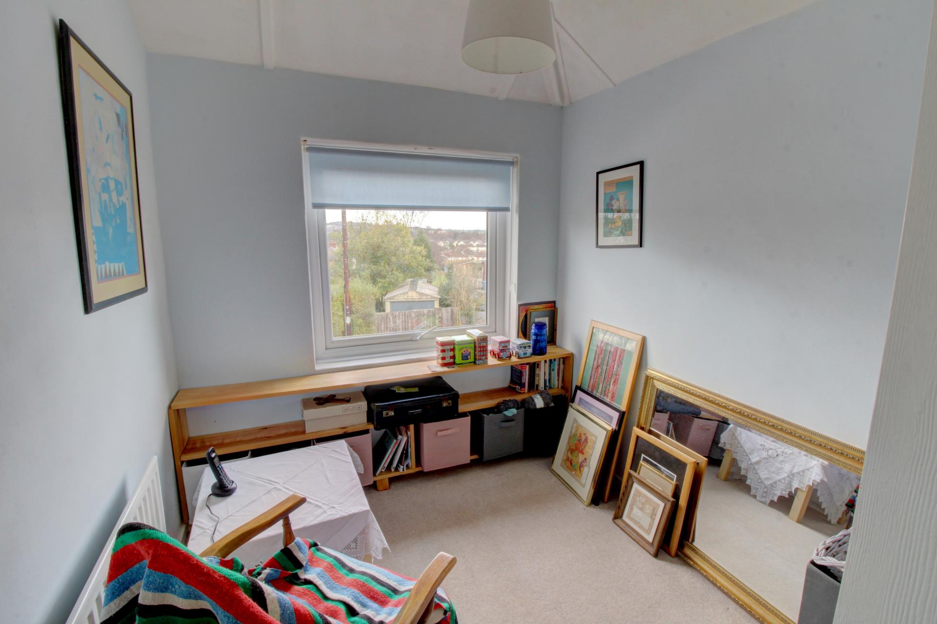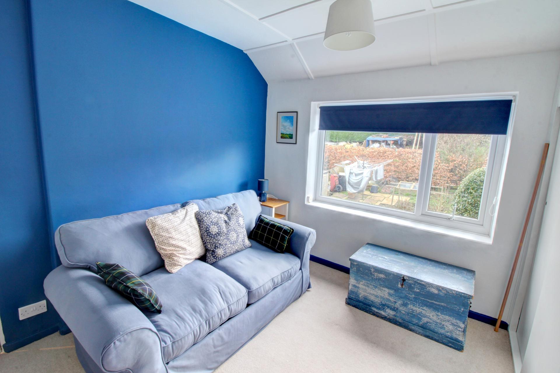 Bedroom 3 is a single room to the front of the property capturing far-reaching views from its elevated position. The shaped ceiling to two sides adds to the warm and cosy feeling presented.