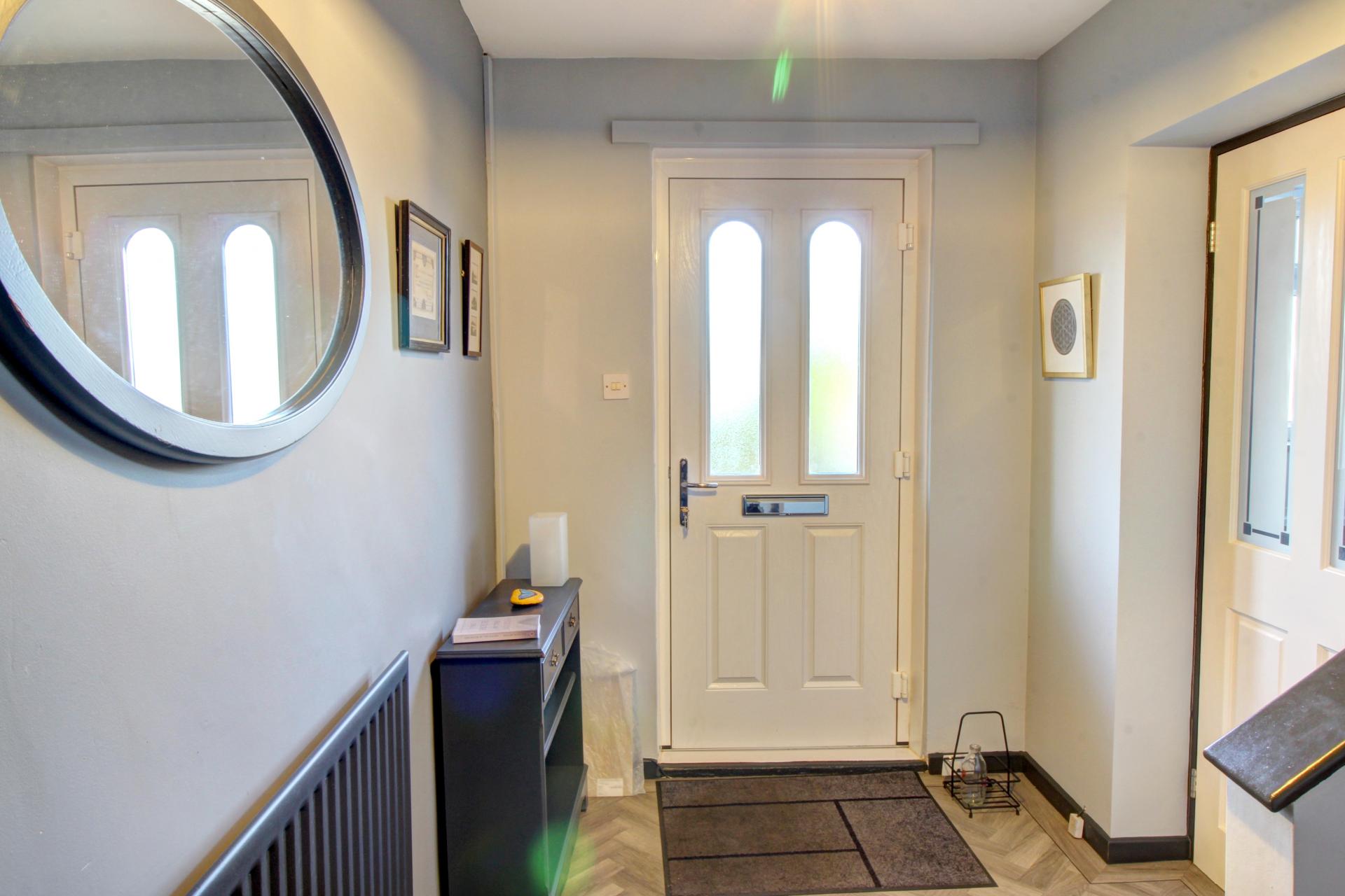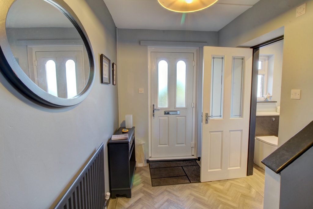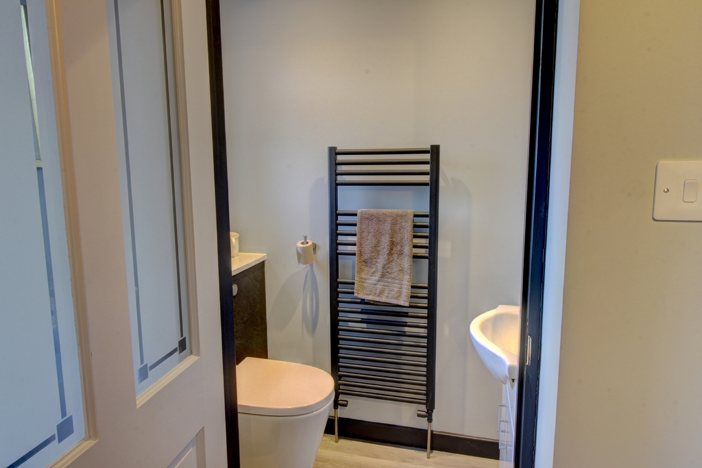A beautifully light and open hallway with stairs leading to the first floor and stunning herringbone Karndean flooring welcomes you. The property benefits from a ground floor WC which is a superb asset as it negates the need to continually frequent the upstairs facilities. The suite comprises a white high gloss vanity unit, a concealed cistern comfort toilet with a push button above and a black heated towel rail. A window to the front allows for natural light with additional lighting by way of spotlights, and the space is finished with the herringbone Karndean flooring which extends from the hallway creating a seamless transition between the different spaces.