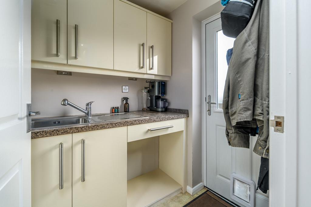 Adjacent is the utility room which offers plumbing and space for a washing machine and a tumble dryer in addition to further units and a single bowl stainless steel sink with a drainer within a granite effect work surface.