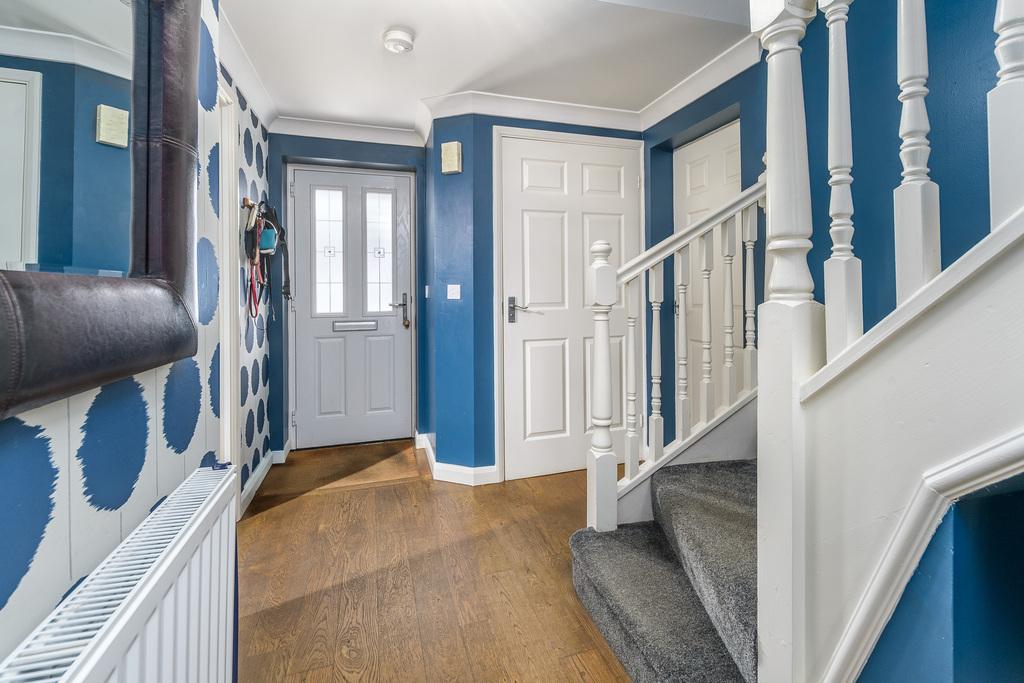 Entry is via the front door which is beneath a covered porch area ideal for sheltering beneath whilst looking for keys during inclement weather or for guests to wait upon arrival. The front door opens into a glorious internal hallway, with practical and durable Karndean flooring, which creates a sleek and stylish look. You are impressed by the quality of finish offered from this point of entry onwards as the décor within each room is stylish and has been carefully chosen to create a delightful impression. Within the hallway, stairs ascend to the first floor and various doors lead off, one of which provides useful entry to the garage which offers storage in addition to housing the gas boiler for ease of access. There is a useful recessed area beneath the stairs which presents storage space or could be an ideal retreat for a fury friend. The ground floor WC is a superb asset as it negates the need to continually frequent the upstairs facilities. The suite comprises a wood look unit housing the concealed cistern toilet with a push button behind, a chrome heated towel rail and a vanity unit with a rectangular hand wash basin on top with a splash back which complements the rest of the décor within the room. Two high level cupboards offer excellent storage, and a window allows for natural light.
