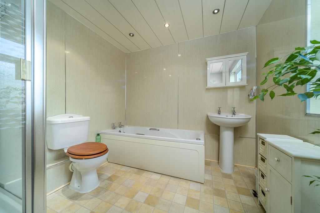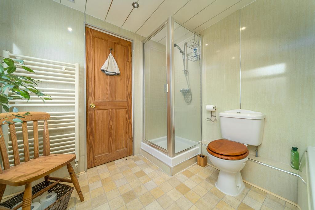 The stripped wood floorboards continue up the staircase which details fabulous woodwork. The half landing provides access to the spacious bathroom which comprises a jacuzzi style bath, a pedestal wash hand basin, a separate corner shower cubicle, a cream-coloured heated towel rail and a close coupled toilet with a push button. A window allows for natural light with spotlights within the low maintenance ceiling adding brightness. The space has been finished with attractive wet walling.